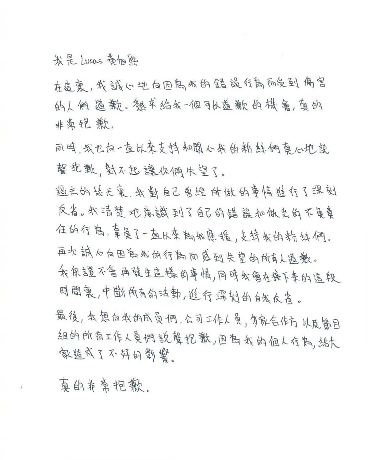 Lucas最新也貼出手寫信道歉,寫下:「過去的幾天,我對自己曾經所做的事情進行了深刻的反省。清楚意識到了自己的錯誤和做出的不負責任的行爲,辜負一直以來為我應援、支持我的粉絲們。」並表示會中斷所有活動,進行深刻的自我反省。