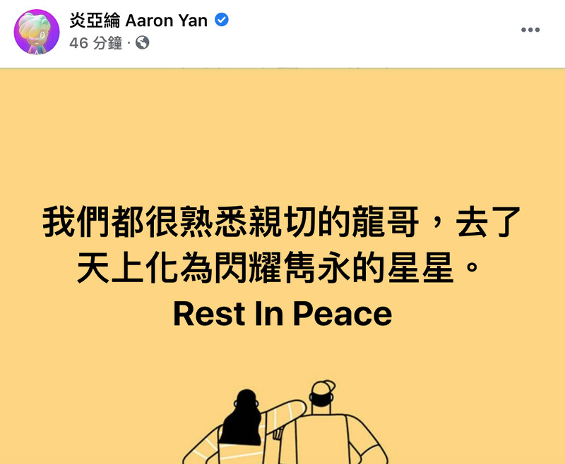 炎亞綸也在臉書哀悼龍哥,寫下:「「我們都很熟悉親切的龍哥,去了天上化為閃耀雋永的星星。Rest In Peace.」