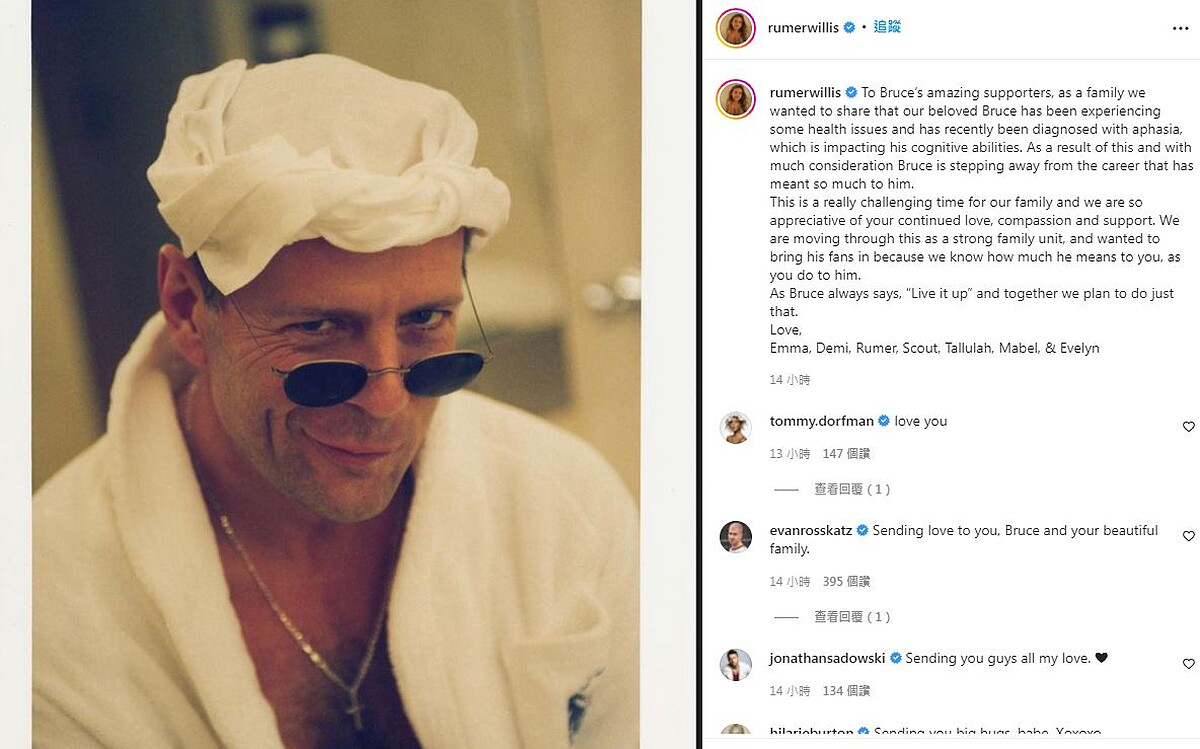 67歲的布魯斯威利出道超過40年,代表作包括「終極警探系列」、《第五元素》、《靈異第六感》、《驚心動魄》等,沒想到卻傳出腦部患上疾病失語症(Aphasia),他的家人沉痛表示將退出影壇,女兒露瑪威利Rumer Willis在IG寫下:「這對我們家人是一個充滿挑戰的時刻,非常感謝你們持續的愛、熱情與支持,我們會堅強度過這一切。」