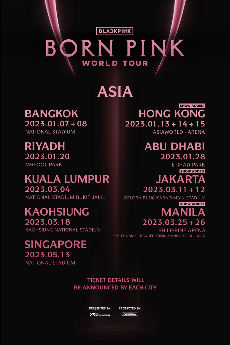隨著新專輯的釋出,也在8月初時宣告全球同名巡迴演唱會正式開催!2022年10月於首爾啟程,從美國到英國,再從歐洲到亞洲,就是要讓悶壞的BLINK們可以再次感受女王們的威力。當然,也沒有忘記台灣的歌迷粉絲,台灣站將於2023年3月18日於高雄國家體育場盛大登場,感受南台灣熱情魅力,相信絕對會讓BLACKPINK畢生難忘。