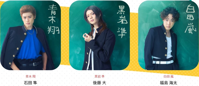 這回的舞台劇還特別加入漫畫和動漫都沒有的原創角色,包含青木翔(石田隼 飾)、黑岩隼(後藤大 飾)、白田嵐(福島海太 飾)、金井老師(大堀こういち 飾)和大野爺爺(酒井敏也 飾),另外總是客氣和善的秀大叔(大高洋夫 飾)也會出現在這回的舞台劇中喔!