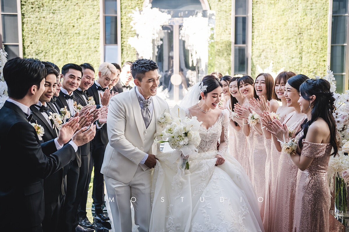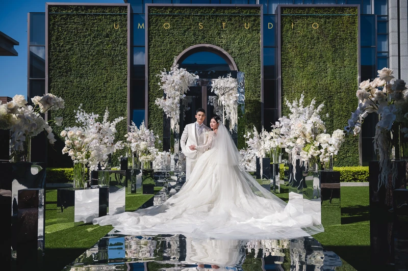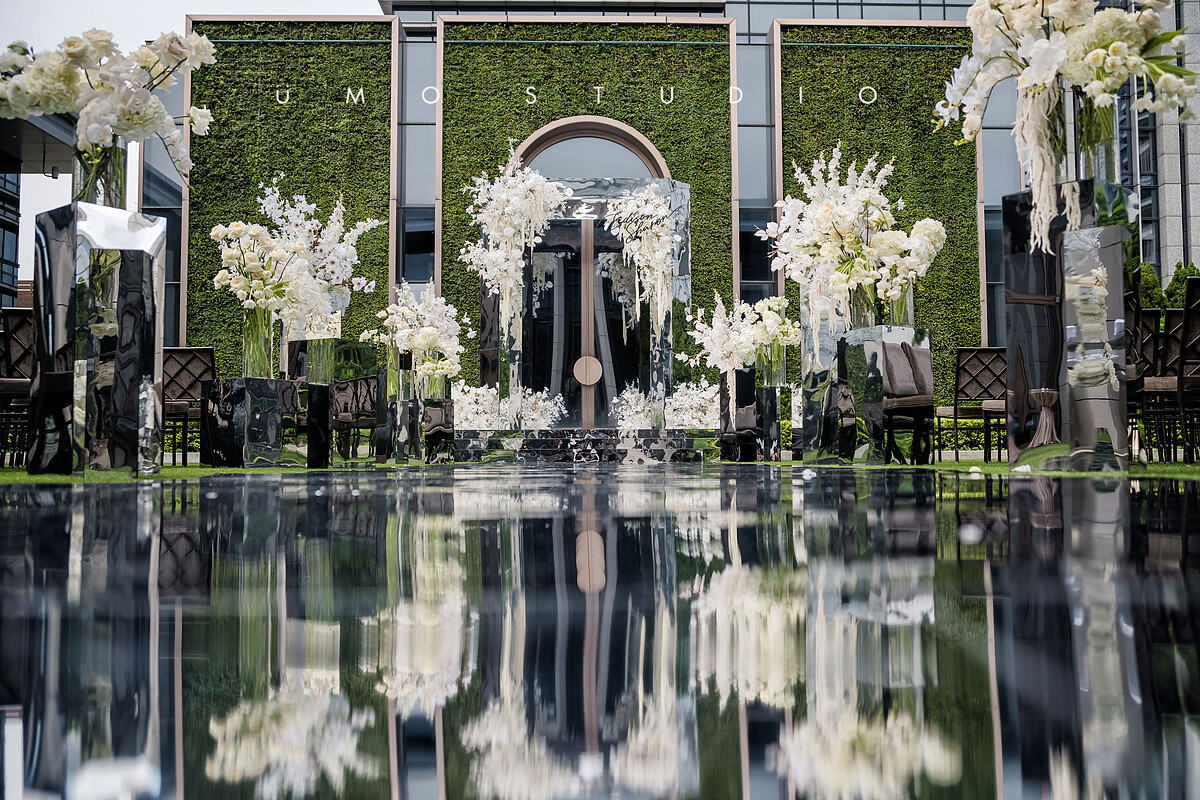 婚宴會場由Tiger Wedding團隊一手打造,戶外部份採用全鏡面拱門、現代利落簡淤大氣的「夢幻無邊鏡像世界」風格,室內部份「白金奢華時尚」風格,整個婚宴會場佈置花了整整36小時。