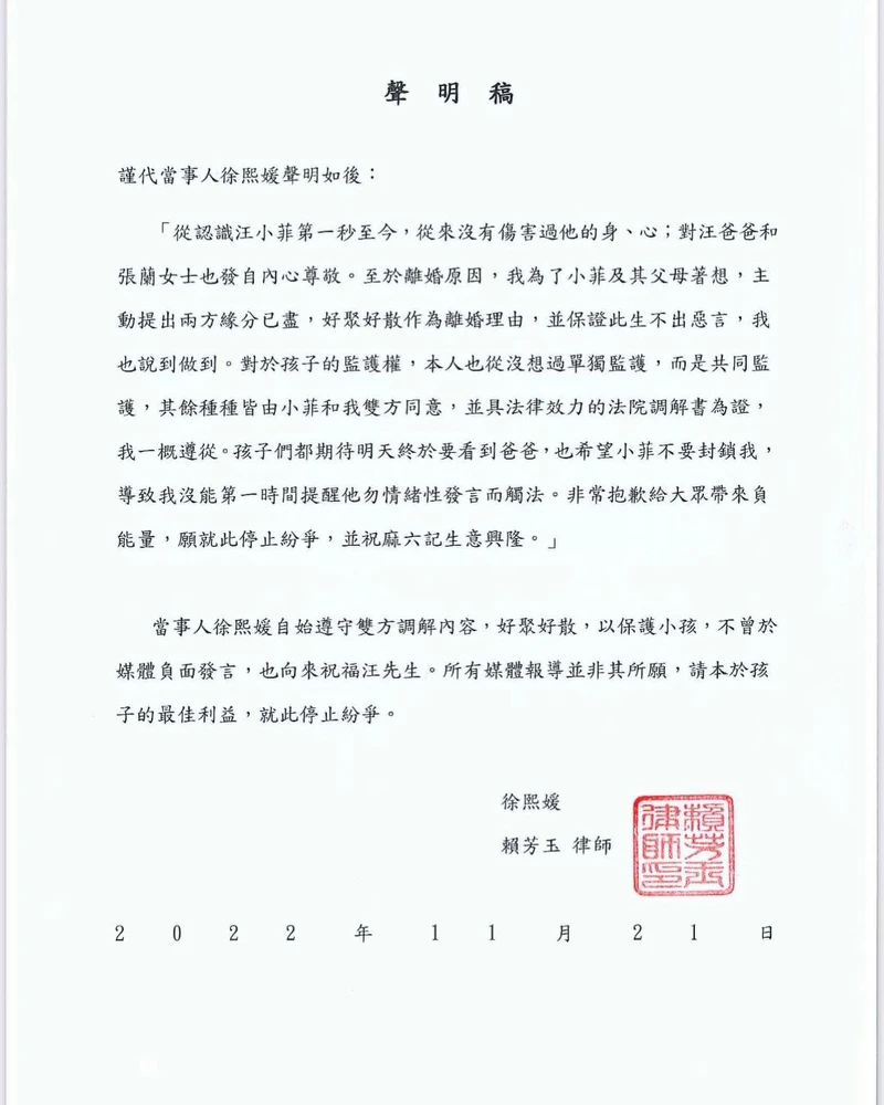 大S除了在11/21(一)透過律師發表聲明,表示:「從認識汪小菲第一秒至今,從來沒有傷害過他的身、心;對汪爸爸和張蘭女士也發自內心尊敬。至於離婚原因,我為了小菲及其父母著想,主動提出兩方緣分已盡,好聚好散作為離婚理由,並保證此生不出惡言,我也說到做到。」