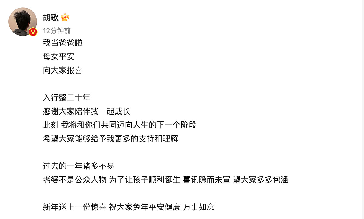 40歲的胡歌宣佈結婚當爸,難得在微博發文的他,寫下:「我當爸爸啦,母女平安,向大家報喜,入行整二十年,感謝大家陪伴我一起成長,此刻,我將和你們共同邁向人生的下一個階段,希望大家能夠給予我更多的支持和理解。」