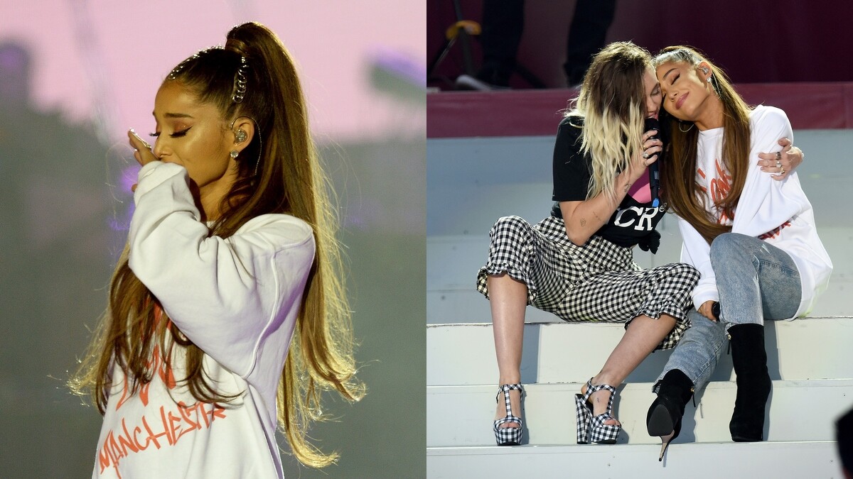 鐵粉必定忘不了這一夜!2017年亞莉安娜舉辦《Dangerous Woman》世界巡迴演唱會到英國曼徹斯特體育館時,散場時不幸發生恐攻、造成23死119傷意外,相當自責的她情緒崩潰,事後患上創傷後壓力症候群(PTSD)及焦慮症,令無數粉絲相當心疼。10天後她勇於重回現場舉辦公益演唱會,強忍淚水與麥莉希拉、黑眼豆豆一起合唱,全場氣氛相當動人。