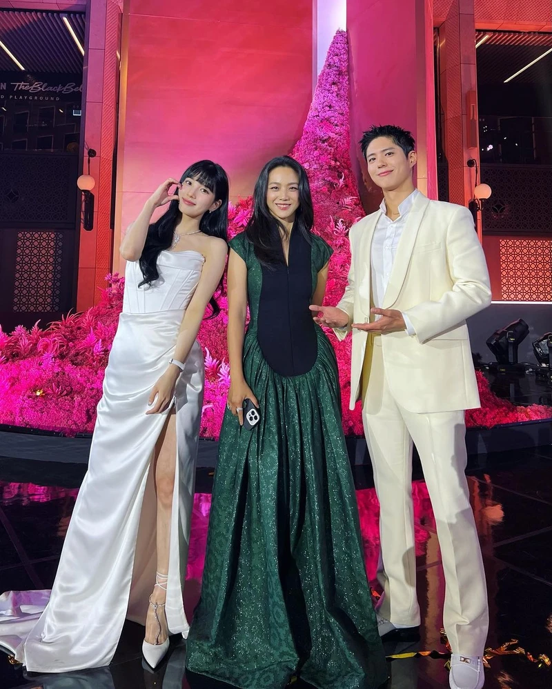 以《分手的決心》第二次榮獲百想影后頭銜的湯唯,新電影《Wonderland》與秀智、朴寶劍、崔宇植與孔劉等人合作,百想典禮遇見的三人,留下合影氣勢十足啊!