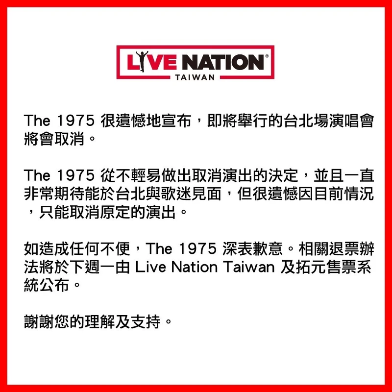 理想國發表The 1975演唱會取消全文:「The 1975從不輕易做出取消演出的決定,並且一直非常期待能於台北與歌迷見面,但很遺憾因目前情況,只能取消原定的演出。如造成任何不便,The 1975深表歉意。 相關退票辦法將於下週一由Live Nation Taiwan及拓元售票系統公布。謝謝您的理解及支持。」