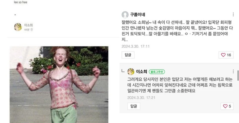 而韓韶禧在分手前還在部落格發佈了一張當年妮可基嫚與湯姆克魯斯離婚時,舉起雙手高呼的模樣,似乎也在暗指自己解脫的心情。也有粉絲留言讚韓韶禧做得好,韓韶禧則回覆粉絲驚曝「是啊,當事人閉口不談,但我想盡辦法做點什麼,他卻說時間久了都會忘記的」,表示自己沒辦法用沈默的方式去對待粉絲,但事後留言也刪除。