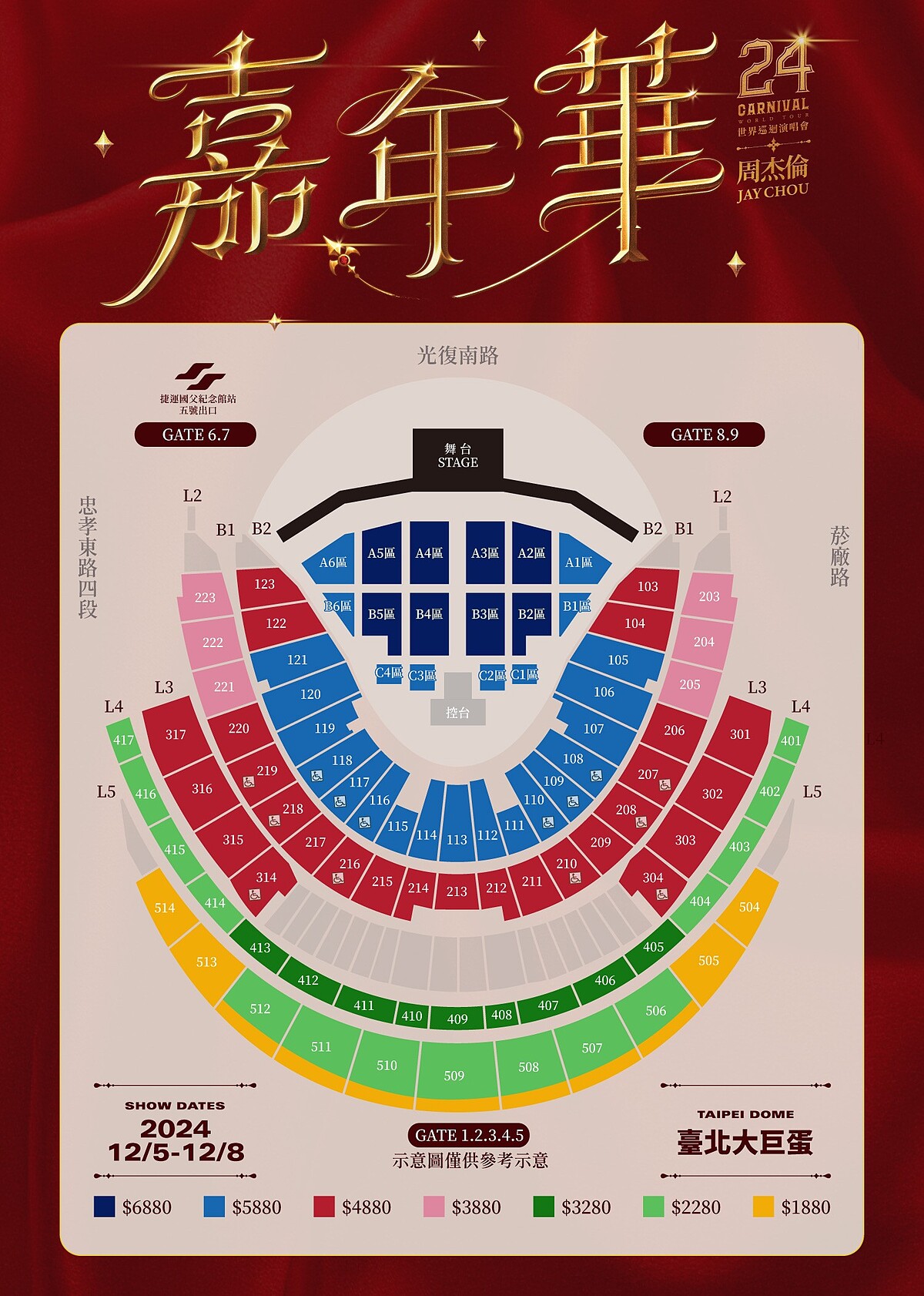 票價:NT$ 6880 / 5880 / 4880 / 3880 / 3280 / 2280 / 1880