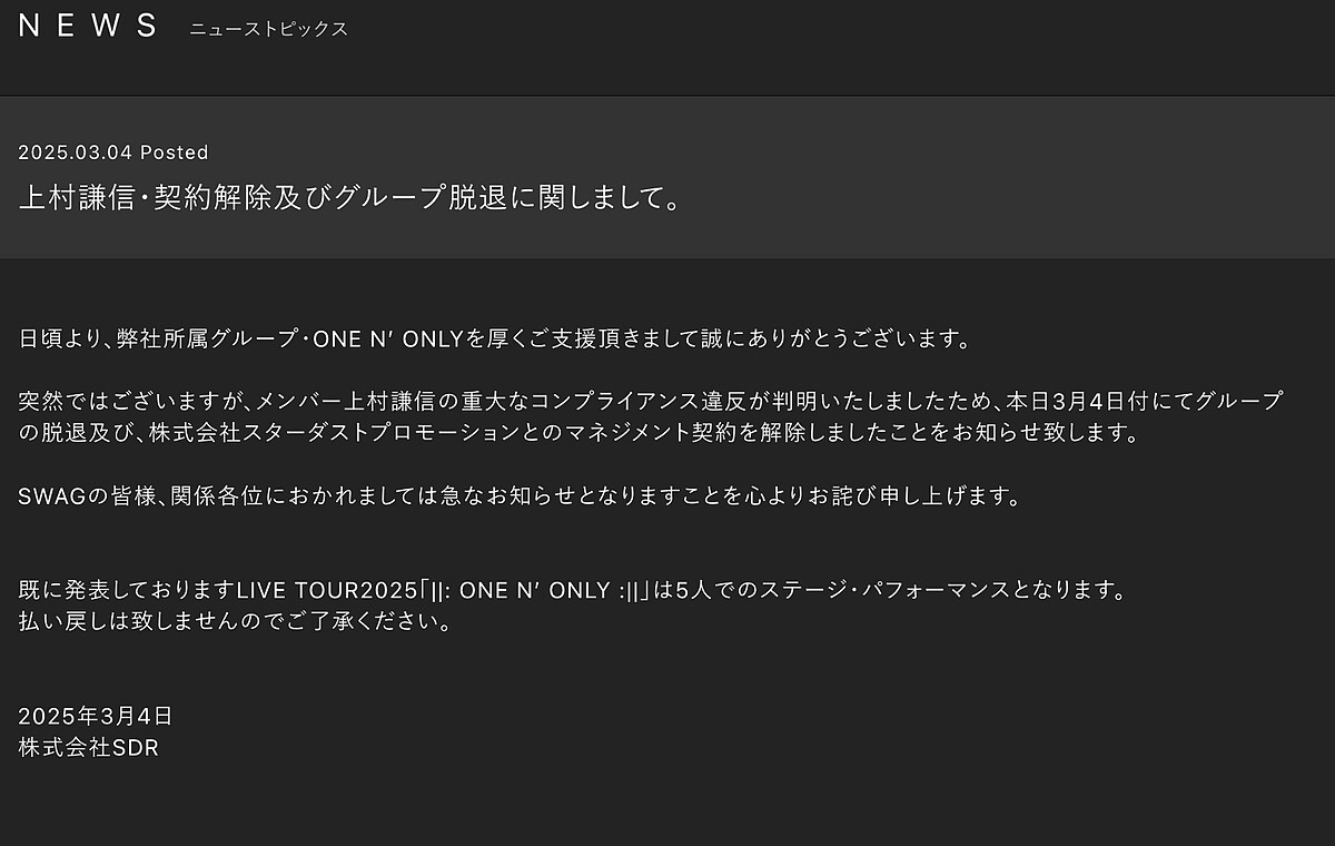 然而就在演藝事業如日中天之際,星塵傳播突然發布聲明,宣布與上村謙信解除經紀合約,並要求他退出ONE N' ONLY,聲明中僅表示上村謙信「涉及重大違反合約規範的行為」,但並未透露具體細節,團員也在IG上透露難以置信且措手不及的心情。突如其來的解約消息讓粉絲們措手不及,紛紛在社群媒體上表達震驚和不捨。
