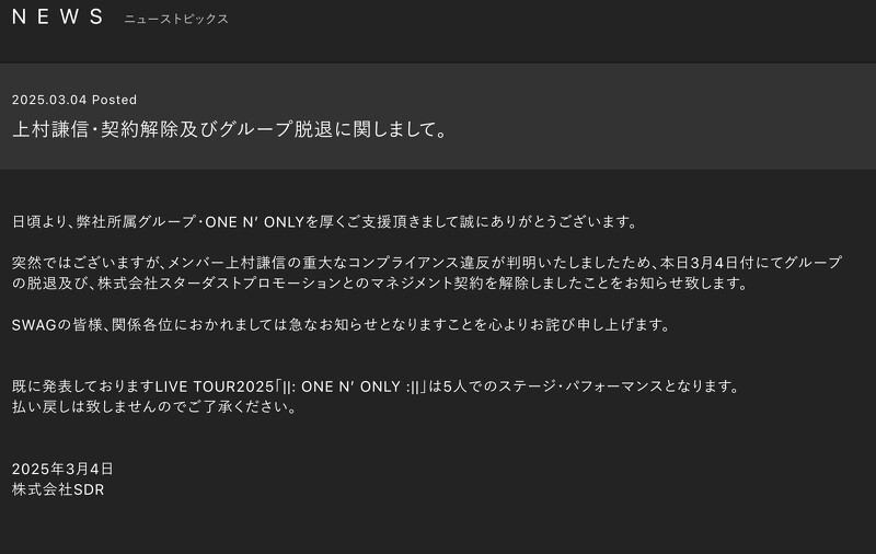 日本演藝圈投下一顆震撼彈,隸屬於星塵傳播(Stardust Promotion)的男星上村謙信,驚傳因「重大違反合約規範的行為」遭公司無預警解約,並退出所屬偶像男團ONE N' ONLY,消息一出引發粉絲一片譁然。