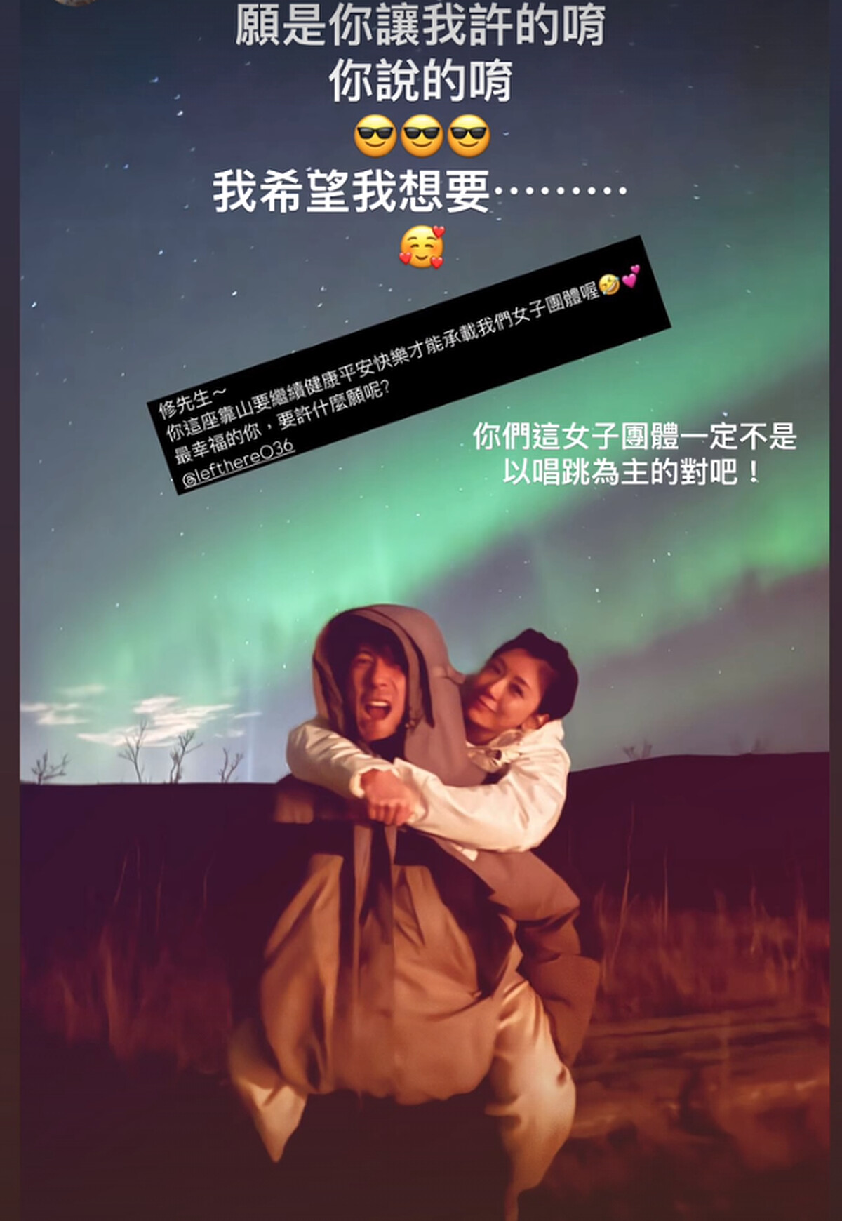 而修杰楷也轉發回應「願望是你讓我許的唷,你說的唷,我希望我想要……」隔空甜蜜互動閃瞎網友。