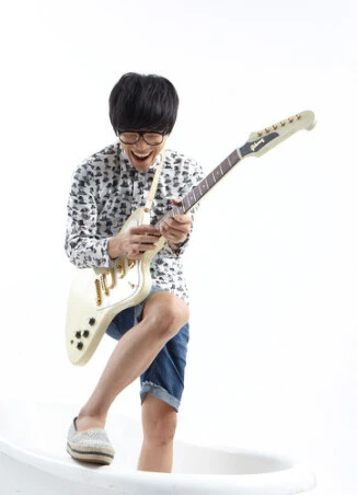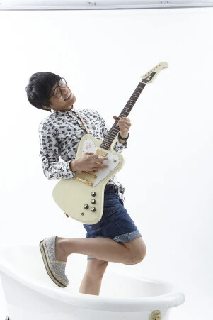 這次帶來拍照的吉他是在日本買到的,是第一次在雜誌上亮相哎。仔細看,它上面有個 Firebird 圖案,沒錯,那就是它的名字。我覺得它很好看。買它的那刻我想到的是:人們為什麼會記住上台表演的人?他的外觀、表演動作、音樂風格、拿的樂器,都有可能是原因。身為一個吉他手,我也會喜歡搜集像這樣美麗的吉他啊。而且它上面金金亮亮的,在家練習時也會覺得很有舞台感,自我感覺很良好。建議大家覺得生活苦悶時弄些發亮的東西在身上,可以催眠自己人生沒有那麼低潮。哈!哈!哈!