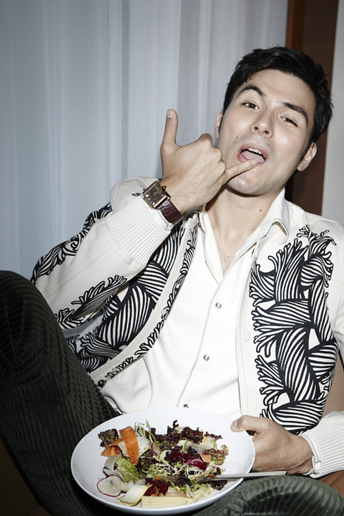 這就是小岳,回答總帶著獨特的見解,那是在藝術家父母有機教育下自然生長的小孩,習得的觀看世界的方式。好比問他最喜歡手上這只卡地亞腕錶什麼地方?他說,「我很驚艷它是透明、中空的,時間本來是一個不存在的概念,但這支錶會讓你覺得時間確實存在,機械轉動著,卻又好像隨時會瓦解。卡地亞對時間真的有研究,一種對文化的了解,對時間的認知。以前,鐘是工業時代人類新的信仰和科學,像英國的大笨鐘,人類用時間在宇宙定位自己,而有了方向、規律和規則;現在數位時代手機就能看到時間,時間變得無所不在,我反而會希望能有一支錶,提醒我這些事情。」