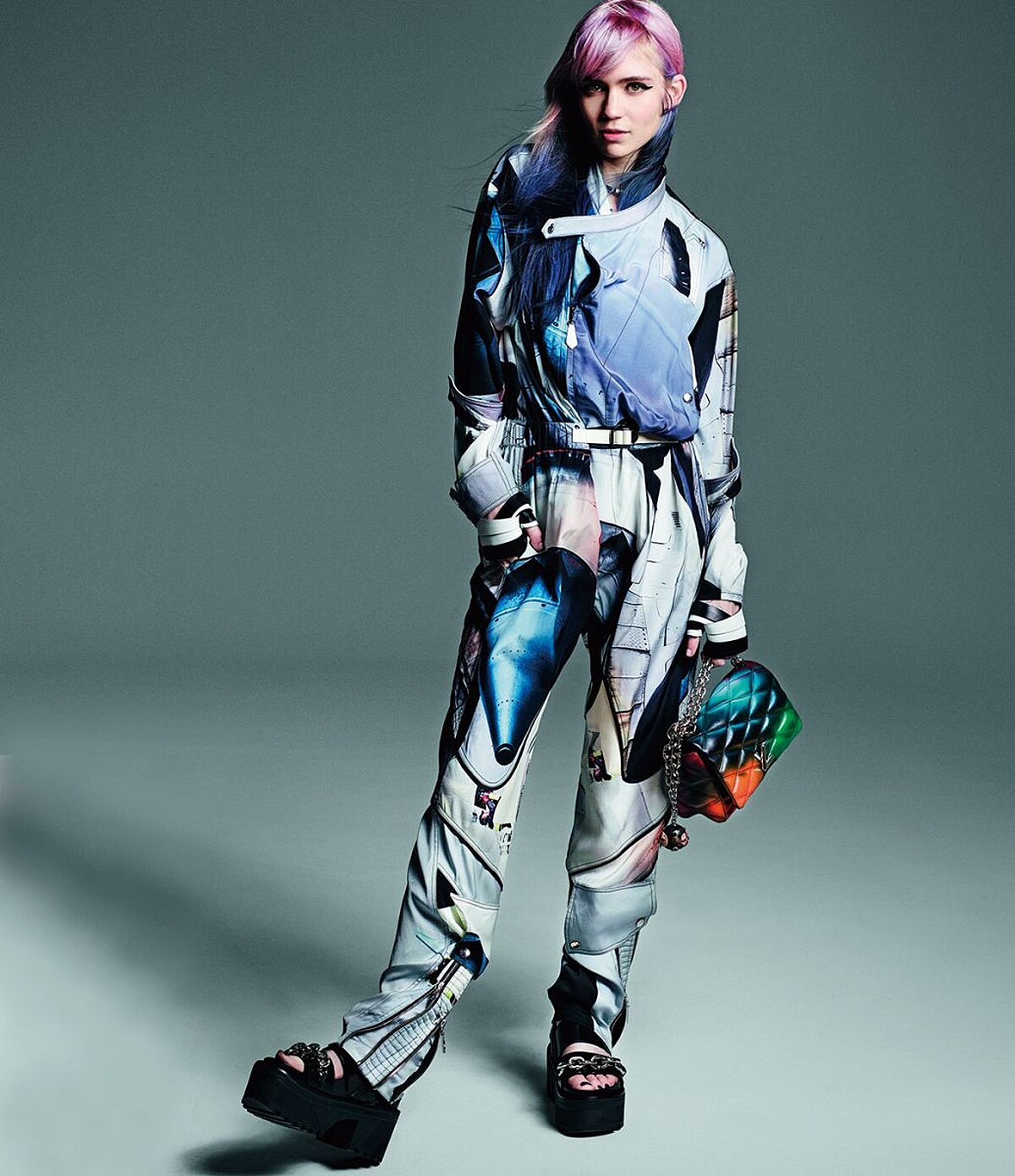 因為獨具風格的音樂和品味,平時打扮幾乎帶點動漫女英雄風格的 Grimes 也被 Louis Vuitton 設計總監 Nicolas Ghesquière 相中,讓這位另類女伶成為新繆思。對於自己的時尚初體驗,Grimes 坦言非常興奮。「首先是我從來沒看過直升機!然後我覺得 Nicolas 的設計跨越了奇幻和優雅的界線,總是有些很瘋狂的參考資料(他跟我說,上一季他們看了很多《新世紀福音戰士》)。即便想像很瘋狂,但完成品總是非常時髦、世故優雅,有著極高品質。我想我對音樂也是這樣看待,他的磁場跟我十分相似。」
