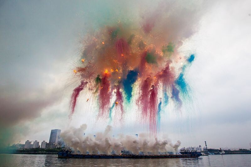 他頓了一下繼續說:「當然每次的主題都不一樣,可是爆炸就是一個看不見的能量。火藥拿在手上就是混合物,像沙一樣的,可是它點起來產生的爆炸,讓你把自己放在一個不能控制的、偶然性的狀況,得以跟這個看不見的能量對話。通過這個看不見的能量,來表現一個未知的世界關係,我覺得是很好的。你永遠需要跟世界對話,已知和未知的。」
