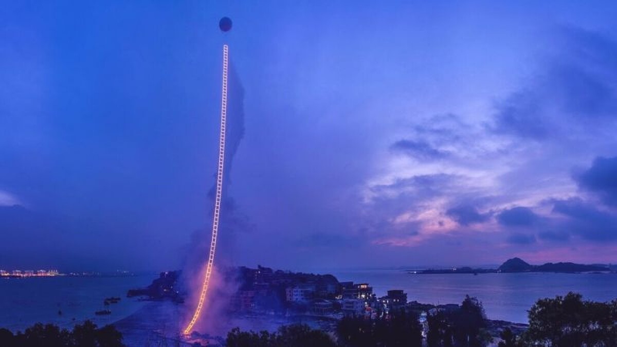 凌晨4點49分,中國泉州漁村的海邊,點火者引燃了天梯,寂靜的漁村小鎮被火藥燃起了生命,火藥將夜空染成了亮白,黑夜不再是黑夜,在黎明前微亮的天幕上劃出一道超現實的光線殘影。這個為時僅僅150秒的爆破計畫,對於蔡國強而言,一路走來醞釀了21年。如今,也透過 Netflix 的紀錄片,由奇女子鄧文迪製作的《天梯:蔡國強的藝術》,讓更多人知道這個迷人的故事。
