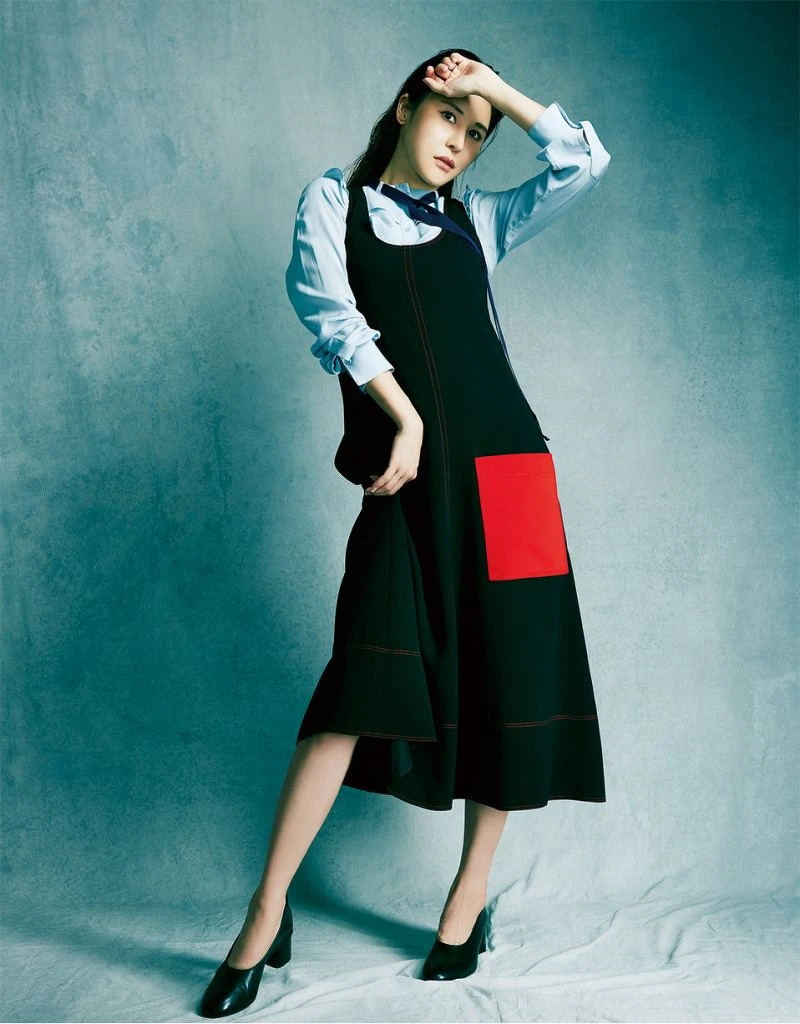 水藍色絲質襯衫、紅色口袋拼接黑洋裝、黑色矮跟鞋,all by Joseph。