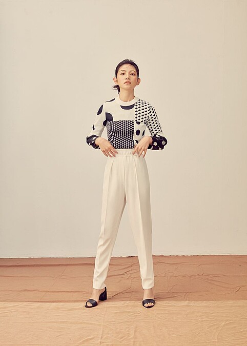 圓點上衣、白色長褲,both by Sportmax