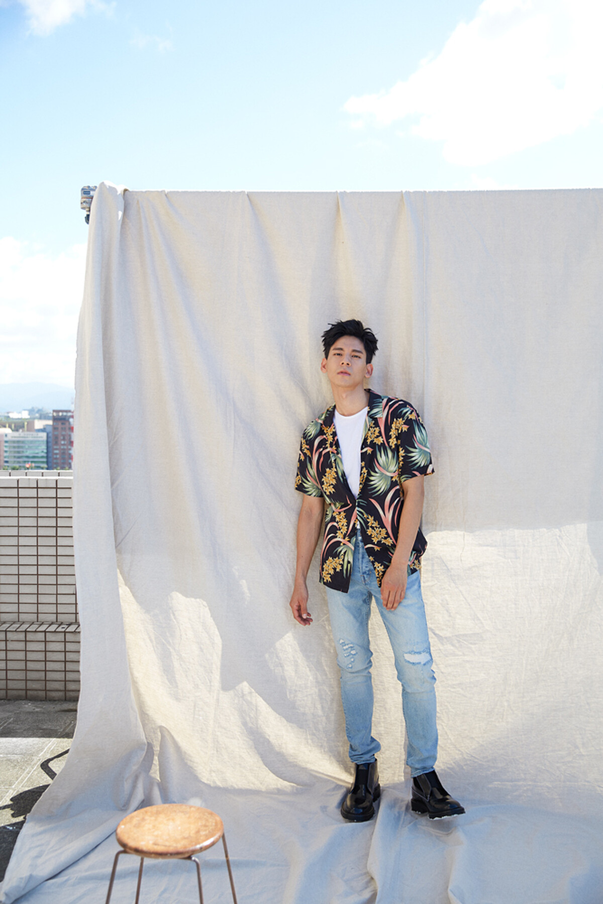 印花短袖襯衫、白色圓領 T-Shrit、淺色丹寧褲,all by AllSaints;漆亮皮短靴,H&M Studio。