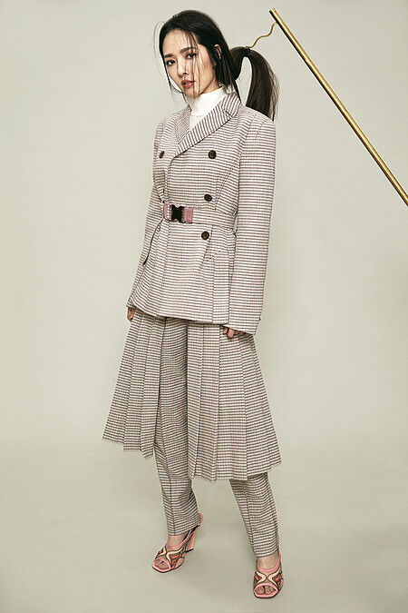 格紋西裝外套、針織高領上衣、百摺半身褲裙、粉色低跟鞋,all by Fendi。