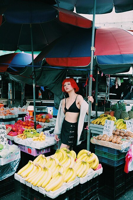 如果你在街上巧遇謝文馨,你的眼光肯定會駐足停留,模特兒獨有的高挑身材、迷濛的大杏眼和高挺的鼻子,人美卻不走著一般的妹仔調調。為了這次的拍攝,她穿上寬鬆的滑板褲和運動內衣,戴上極為搶眼的紅色假髮,不需要長捲髮、網紅洋裝和高跟鞋才好看,前衛、時髦、街頭中帶點奇幻氣息,文馨完美混融中性和性感風格。