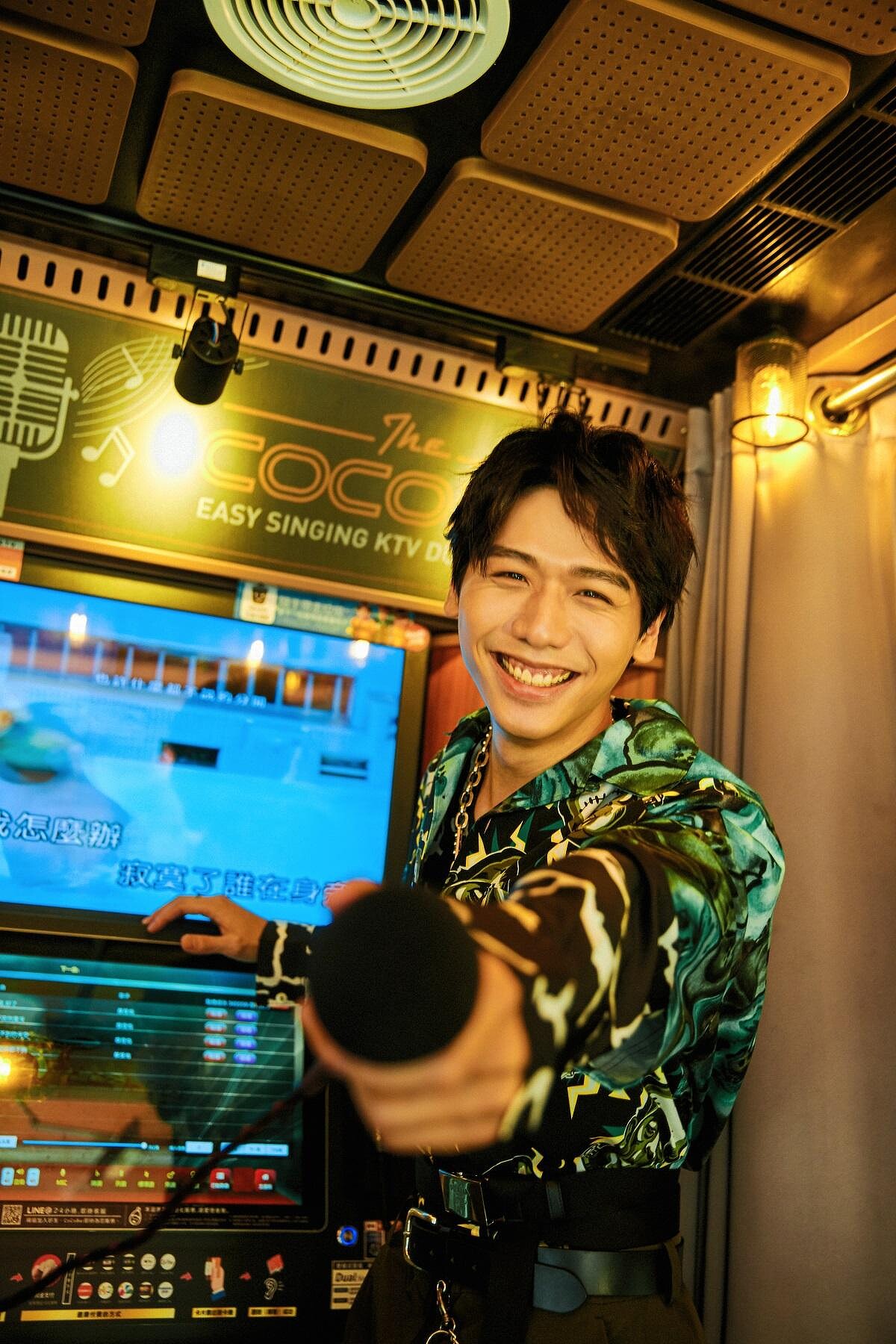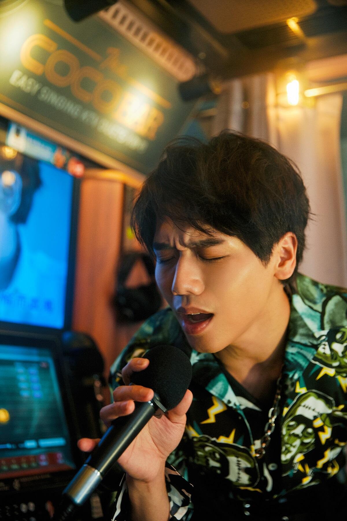 蔡旻佑一進包廂,開心選了KTV模式,先點了幾首陶喆開開嗓,「不明白/不明白/為什麼我不能放得開/捨不得/這個愛/妳是一生一世不會瞭解」。唱得太搖擺,路人開始圍觀,拿手機好奇地錄影,窸窸窣窣傳來「你看是蔡旻佑欸~」原本有點擔心,蔡同學會不會尷尬,結果他根本放、很、開,唱嗨了還自己推開門,嘟麥叫圍觀群眾唱下一句(很難接啦!)開完嗓則進入深情慢歌模式(經紀人怕他再嗨下去,拍出來照片臉很歪),點了〈我們〉〈寂寞好了〉壓壓驚(假音好聽到讓人驚呆了)。