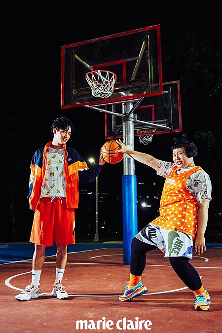 緊接著是「定點投籃」。學長站在小蘋果背後,將球高舉到她臉前,指導她手臂如何出力,眼睛要看籃框哪裡。不曉得是身高差的緣故,還是球場燈光太絢爛,這畫面怎麼驀地有點浪漫。沒幾下功夫,小蘋果奮力跳投,擦板進球!少勳興奮大叫,兩人超嗨擊掌,往下一回合「帶球上籃」邁進。