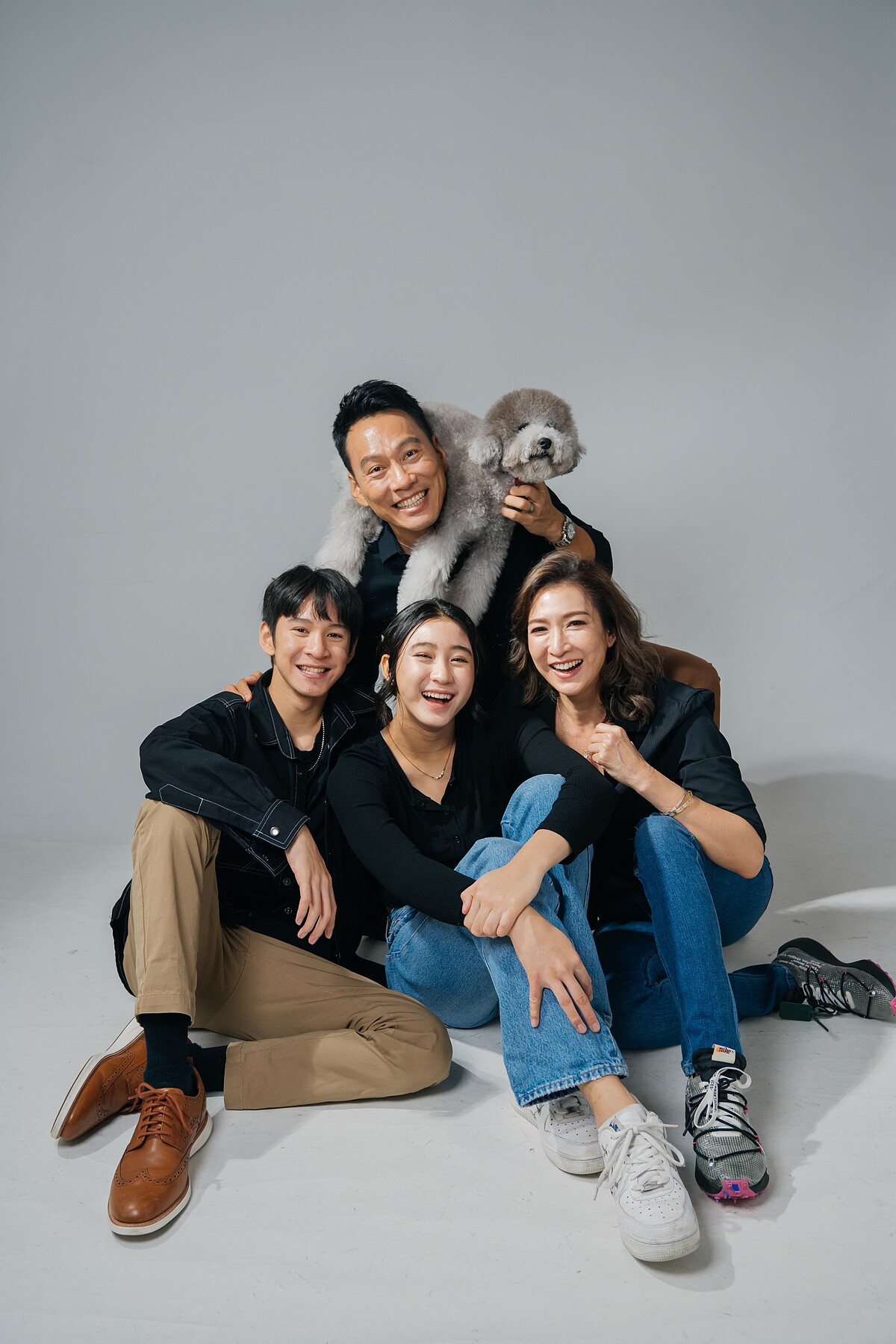 今年新成員毛小孩Kirby加入拍照行列,Kirby精力充沛滿場飛奔,可愛模樣逗樂攝影師、工作人員。孩子日漸長大,以後也會有各自伴侶,全家福照也會越來越多人。若兒子上大學交女朋友,會不會也邀來拍全家福 ? 艾力克斯開玩笑說:「No!要老婆才可以。」