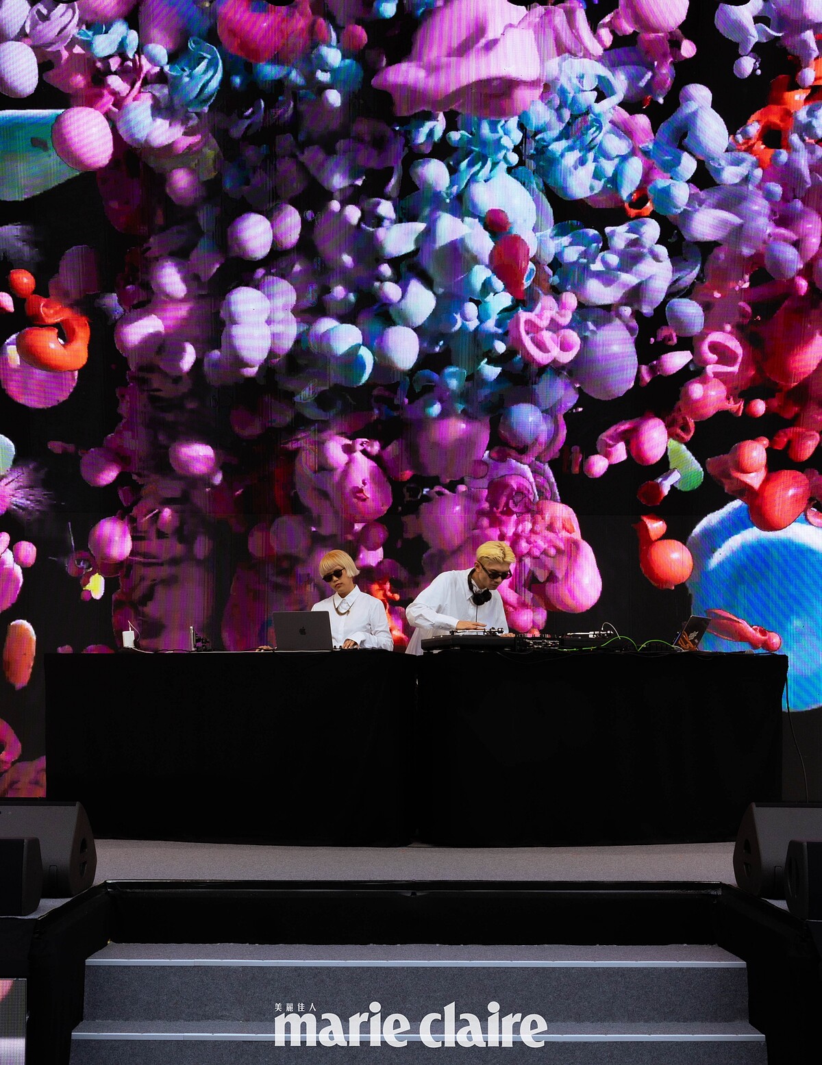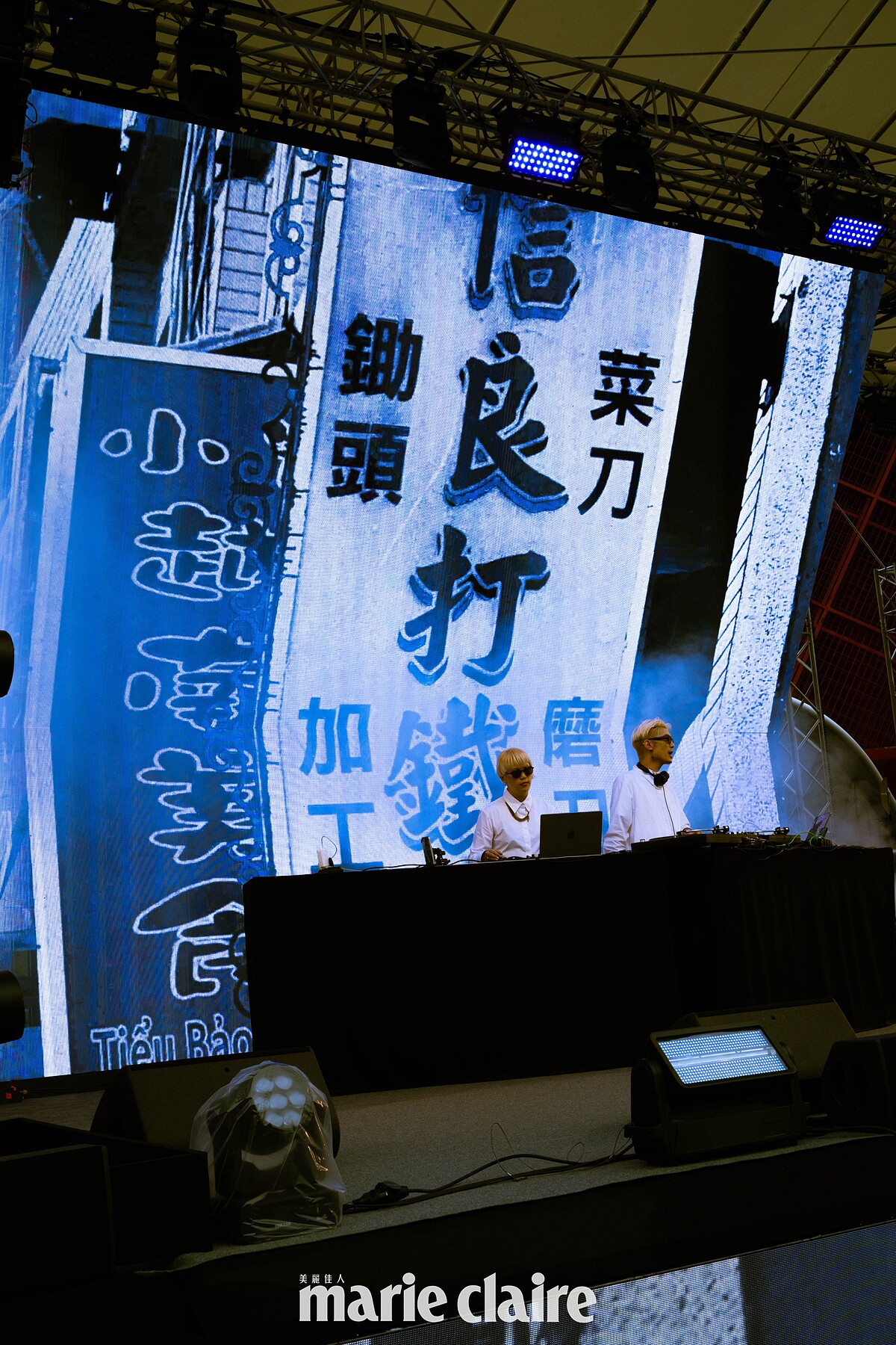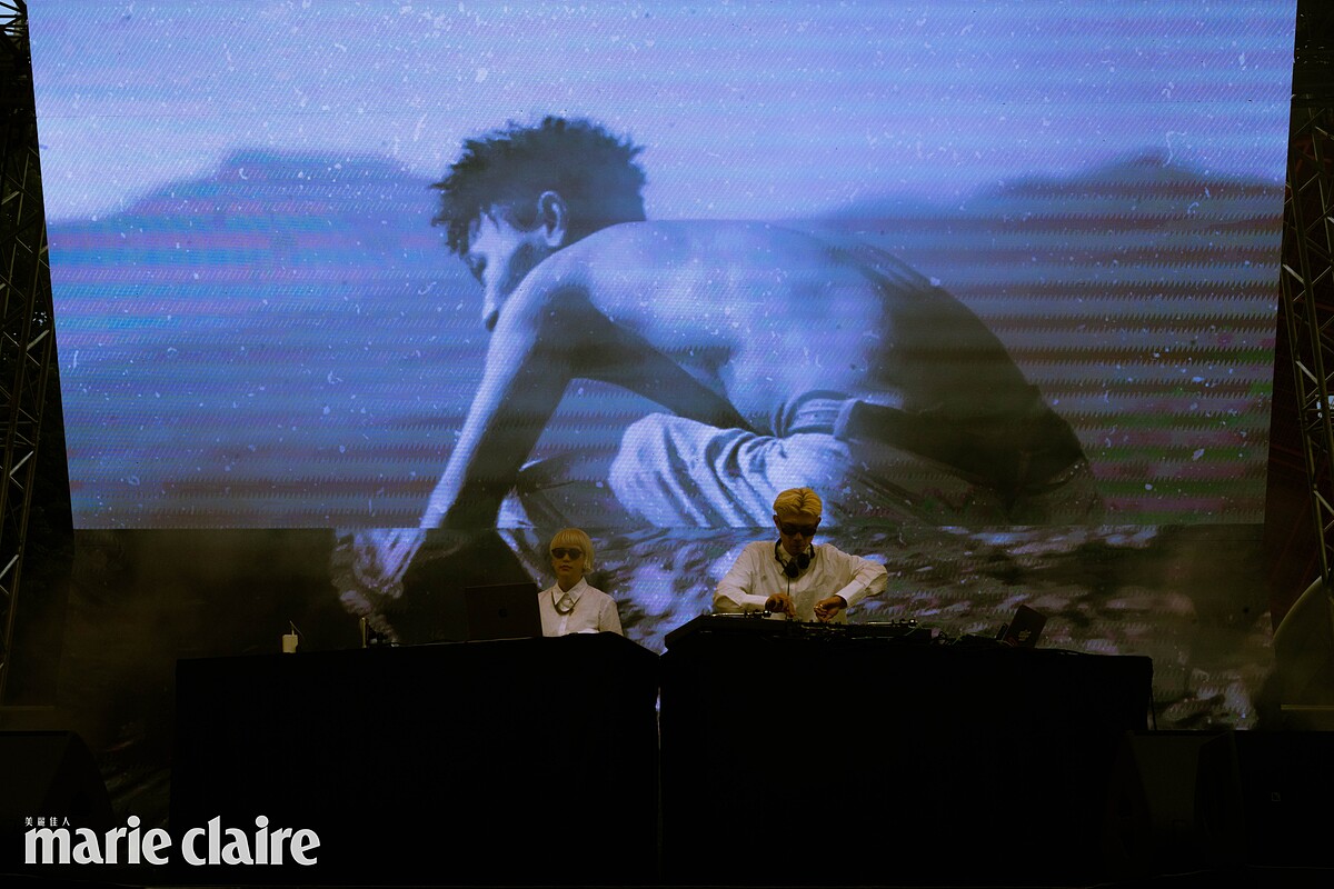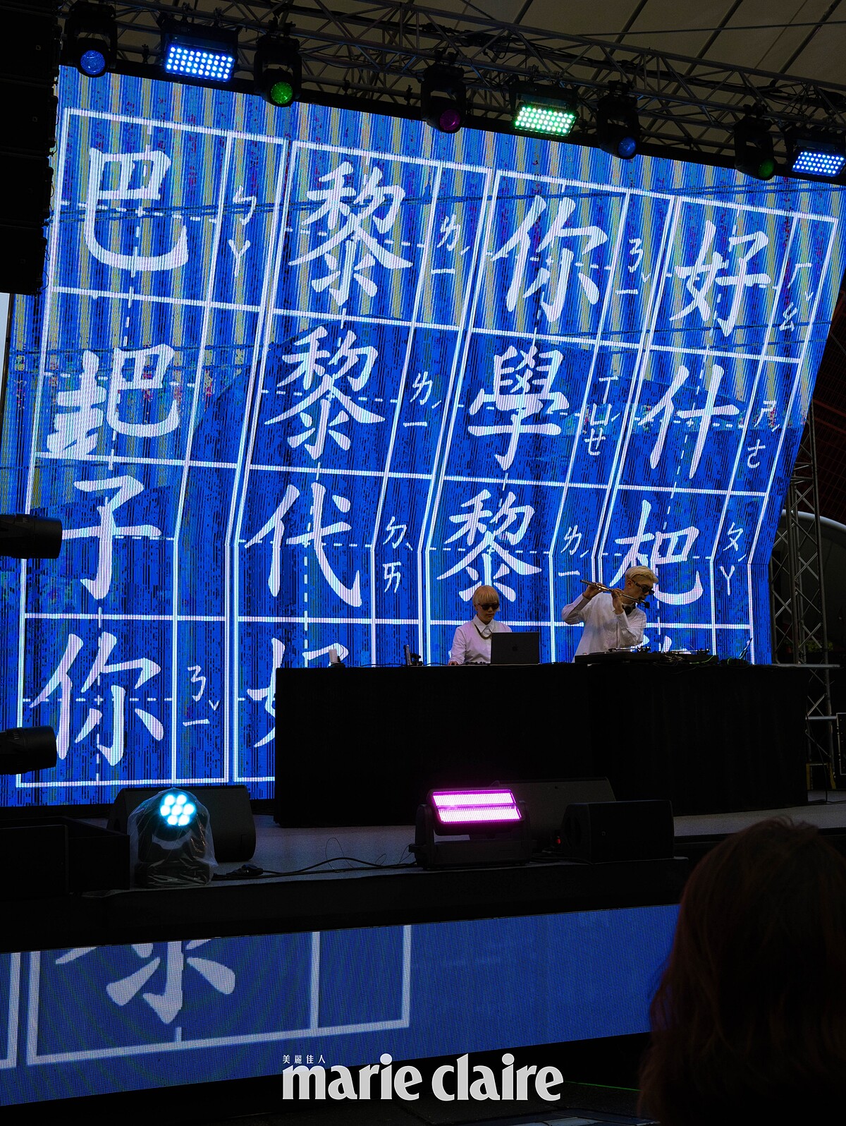 臺上默契的演出花了半年磨合,一切非常有機且即時,彼此的一個眼神或動作都是一條線索,牽引著演出前進。聊到這裡,身為 VJ 的 feiiic 掏出手機,與我分享了一段文字,寫道:「立其身,使與臺齊; 定神細聽,以鼓響為基,光影為引; 以形色富者為起,窮者為伏;神遊其中,怡然自得。」我一臉問號 feiiic 隨後解釋:「文言文很難懂,但主要就是,VJ 這個角色要非常融進音樂裡面。我不是透過眼睛在看,而是用耳朵去感受現場聲音、空氣、濕度、氛圍所醞釀的東西,把它們吸收、內化再轉譯成影像呈現,將音樂具象化。」QuestionMark 想了一下也表示:「音樂就是時間的藝術。時間是個概念上的存在,音樂也是,它是個不具象的藝術型態,但影像卻不是。」