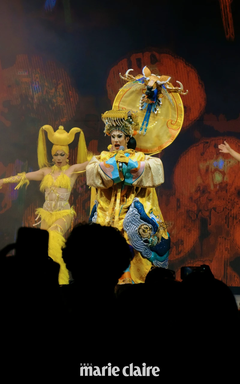 「我覺得今天身為一個變裝皇后,又是臺灣人,很重要的就是讓大家知道我們是臺灣人,這是一個很值得驕傲的價值。」不只是說說,他也真的把台灣的象徵放上服裝。比如頭戴的光環,有一隻青鳥跟一隻鹿,象徵每回有民主大事發生時,人們集結的青島東路;另一個還有袍子上的鯨魚,借古時文人賦予臺灣的雅稱「鯤島」,展現不同神話及歷史元素。