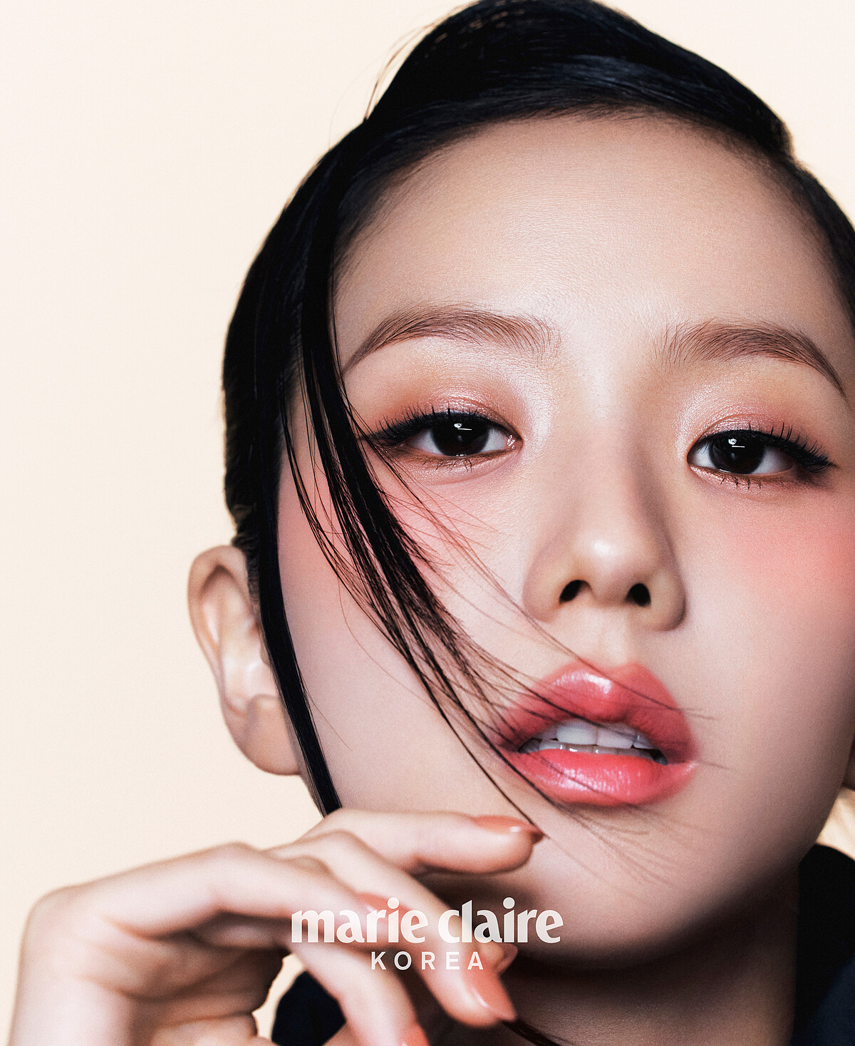 以優雅而堅定的眼神直視鏡頭的Jisoo。 重點單品是「迪奧經典五色眼影 #931 經典黑」。以薄荷綠輕點於眼頭並自然暈開,營造清新氛圍;再以棕色疊擦於下眼線的前後部分,讓眼睛更有神,達到放大雙眼的效果。最後在眼皮中央與臥蠶處輕點閃耀白,更加倍增雙眼的立體感與靈動氣息。頰彩選用「迪奧超完美微醺腮紅露 #04 蜜杏雛菊」,以顴骨為中心大面積暈染,並自然延伸至眼尾,展現靈動神情。雙唇則均勻塗上「迪奧藍星唇膏 #100 杏仁烤奶 MISS DIOR限量版」,與整體妝容和諧呼應,打造出整體高雅氣質。