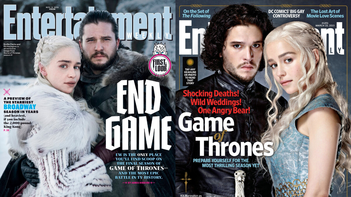 美國最具指標性的電影電視雜誌《Entertainment weekly》也釋出了首張劇照,對比雪諾與龍母5年前同框的畫面,兩人都成熟了不少。