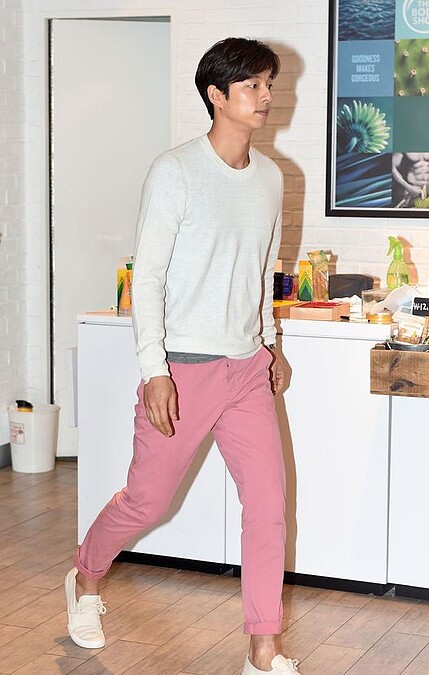 原本就是暖男的孔劉,穿上粉紅色後更顯療癒的氣息,不管是粉紅色衛衣或是粉紅色長褲,運用色塊點綴的高超技巧,讓人不禁沉醉在他的男性魅力中。