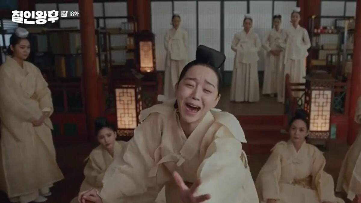 風雲詭譎的宮內,趙大妃和大王大妃假情假意到靈前哭喪,中殿此前故意讓紅蓮幫她上”行屍走肉”的妝,看起來了無生意,兩位前輩哭戲搬演到一半,娘娘自詡「今晚的演技大賞是我的」,孝女白琴真的不算甚麼,殺出”哭悲”的她,要嚎啕出未亡人的椎心刺痛,還配合準備開溜搞笑俏皮的腳戲,申惠善的演技又再次征服了我們。