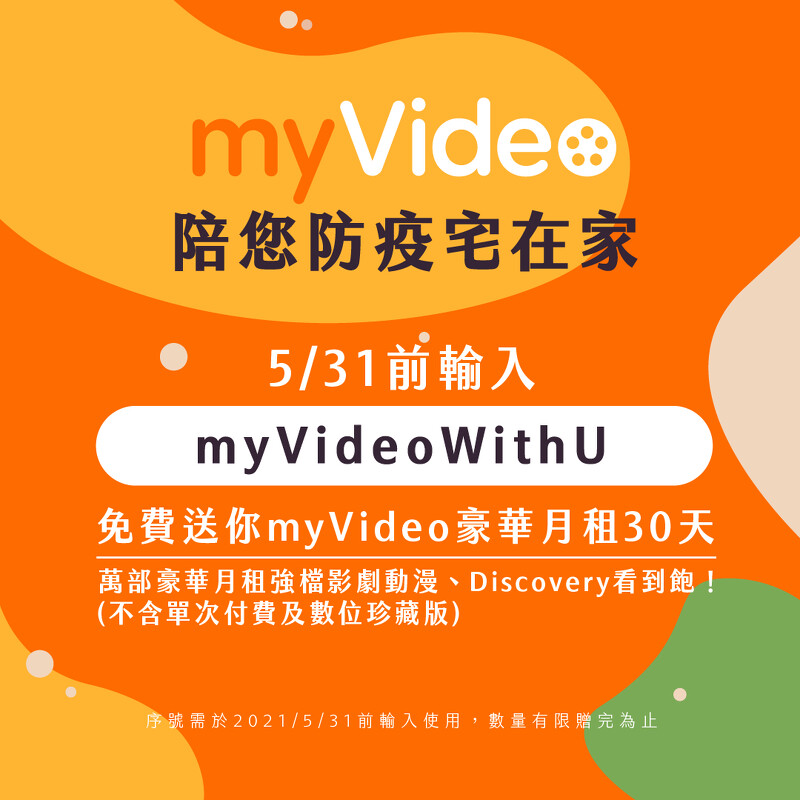 台灣大哥大旗下的「myVideo」最豪氣!直接讓民眾享受「30天豪華月租」方案,只要於5/31前輸入指定序號「myVideoWithU」,便能立刻無限觀看包含「電影、動漫、兒童」月租館與節目、Discovery、戲劇館內共超過17000部影片,數量有限兌完為止,大家手叫要快。