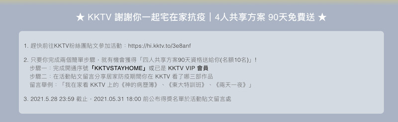 由日本KDDI集團旗下KKBOX所成立,KKTV臉書粉絲團祭出「4人共享方案90天資格送給你」抽獎活動,只要完成開通序號「KKTVSTAYHOME」或已是 KKTV VIP 會員,接著在活動貼文留言分享居家防疫期間,在KKTV觀看的3部作品,即可擁有抽獎資格。