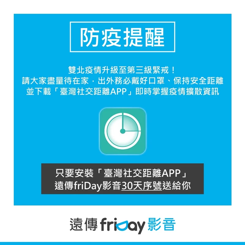 遠傳電信旗下的friDay影音同樣鼓勵大家共同齊心協力防疫,只要安裝「台灣社交距離APP」,並在臉書粉絲團貼文底下附上手機畫面截圖,便能獲得30天免費序號,序號從5/17便開始提供!另外還能輸入指定序號「lovehealth」免費享受30天影劇,後者只兌換到5/18,絕對不能錯過呀!