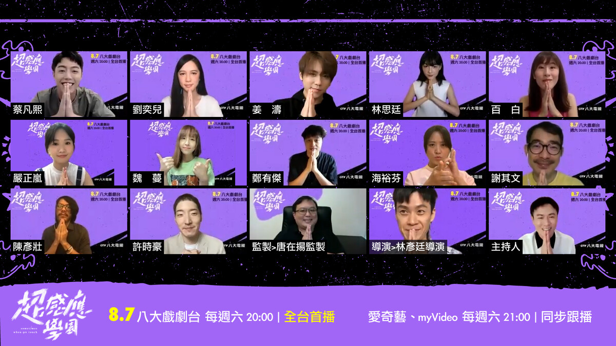 八大電視校園奇幻劇《超感應學園》監製唐在揚、導演林彥廷,率領演員蔡凡熙、劉奕兒、姜濤、林思廷、百白、嚴正嵐、魏蔓、鄭有傑、海裕芬、謝其文、許時豪、陳彥壯等人,一同出席線上首映會。