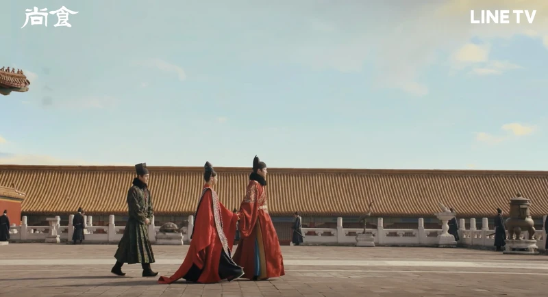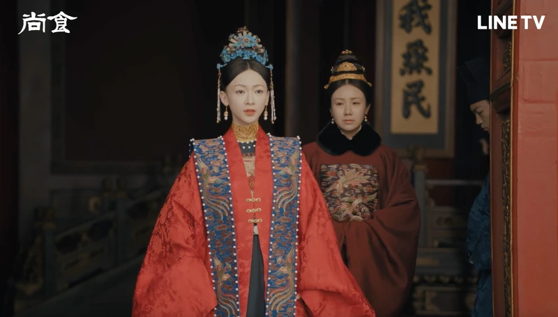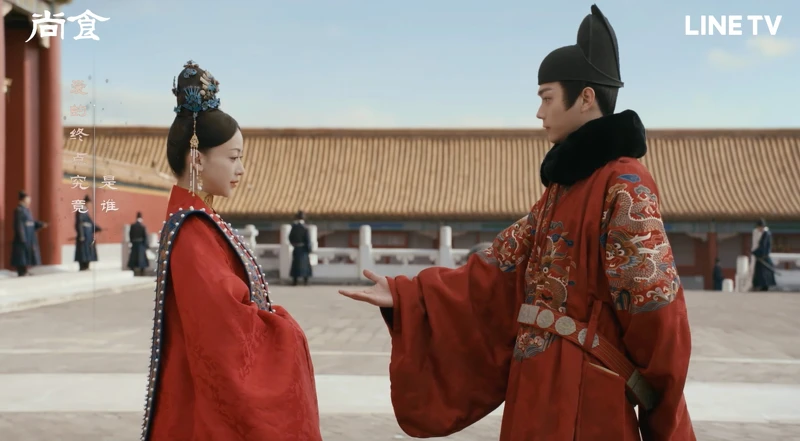 在《尚食》高甜片段當中,穿上婚服的吳謹言,一走出殿外就看見在等她的許凱,還伸出了手要她過去牽,吳謹言見狀不顧禮法直接走向對方,這一幕彷彿象徵了兩人將攜手共度下半生,過程中吳謹言還被一旁的奴婢說「太子嬪,這不合禮儀」,台詞中頗有呼應當初《延禧攻略》那個總是打破規矩的魏瓔珞之感。