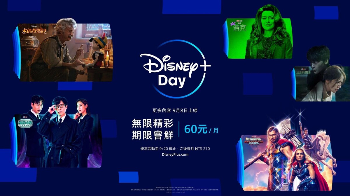 為迎接9月8日的Disney+ Day,迪士尼推出特別優惠方案,9月8日中午12時起至9月20日下午2時59分,新會員和所有符合資格的回購會員將可以一個月優惠價格60元,盡情觀看Disney+ 上的影視內容!