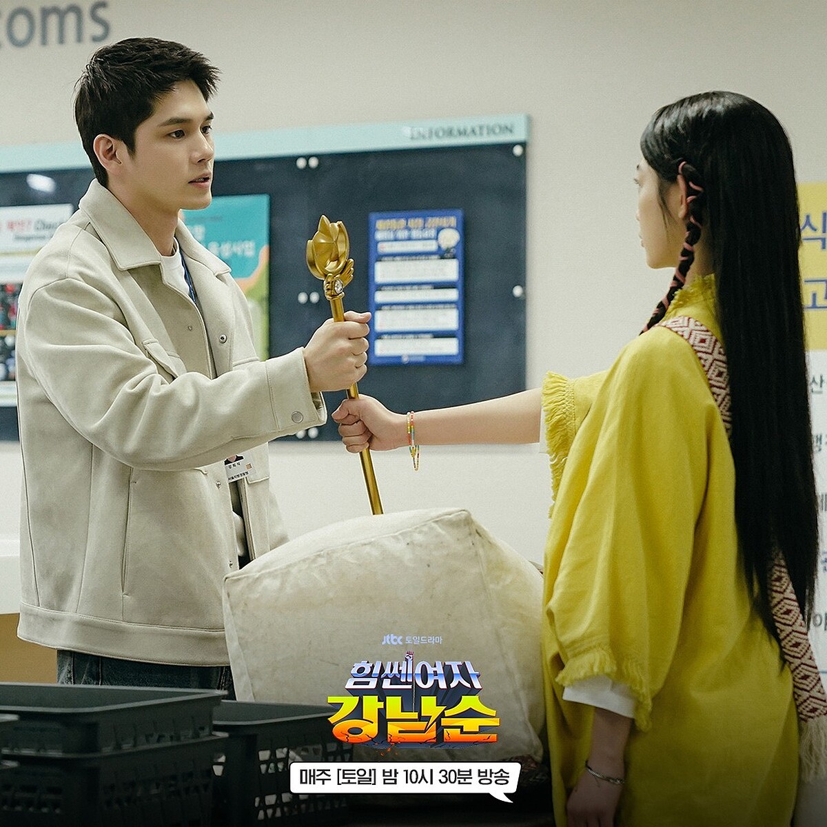 力量超大、能輕鬆舉起大男人丟到十里外的蒙古女孩可汗策策(李瑜美飾)某日想起自己是姜南順,六歲時和父親來到蒙古拍攝大片不小心走失。成年後,蒙古養父母拿出策策小時候衣物和純金庫洛魔法使手杖,讓策策好好回南韓尋親。在機場,緝毒警察康熙植(左)扣押姜南順行李夾帶的純金手杖,從此兩人相識