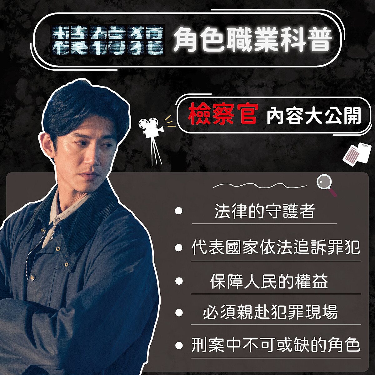 吳慷仁所飾演的檢察官又稱為「法律的守護者」,除了平時依法偵查及追訴罪犯外,還要到處趴趴走!親赴各個犯罪現場,是刑案當中不可或缺的角色。