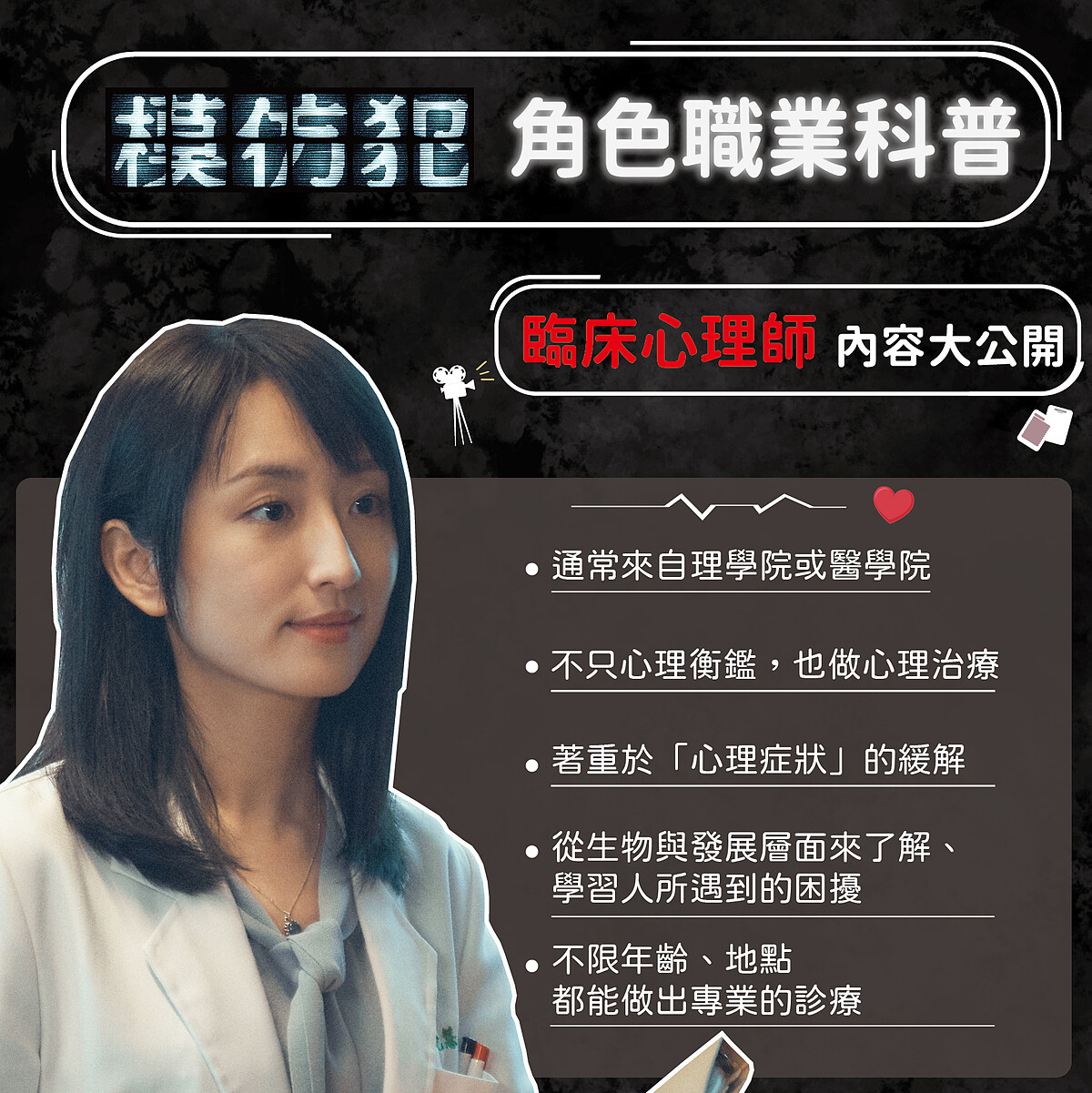 柯佳嬿所飾演的臨床心理師胡允慧,不只替身心相關科別進行心理衡鑑,同時也做心理治療。從裡到外抽絲剝繭,學習人所遇到的困難並加以治療,是最好的傾聽者,不論年齡、不論地點都能做出專業的診療。