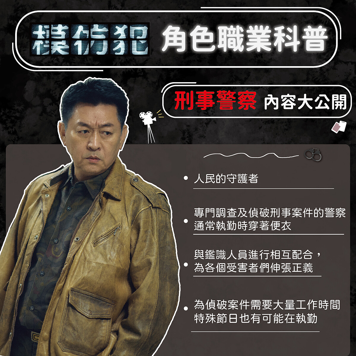 庹宗華飾演即將退役的刑事警察林尚勇,除了要為受害者們伸張正義之外,更需要時常與犯人面對面接觸,可謂是「人民的守護者」,在劇中與郭檢互相配合,共同揭開背後隱藏的真相。