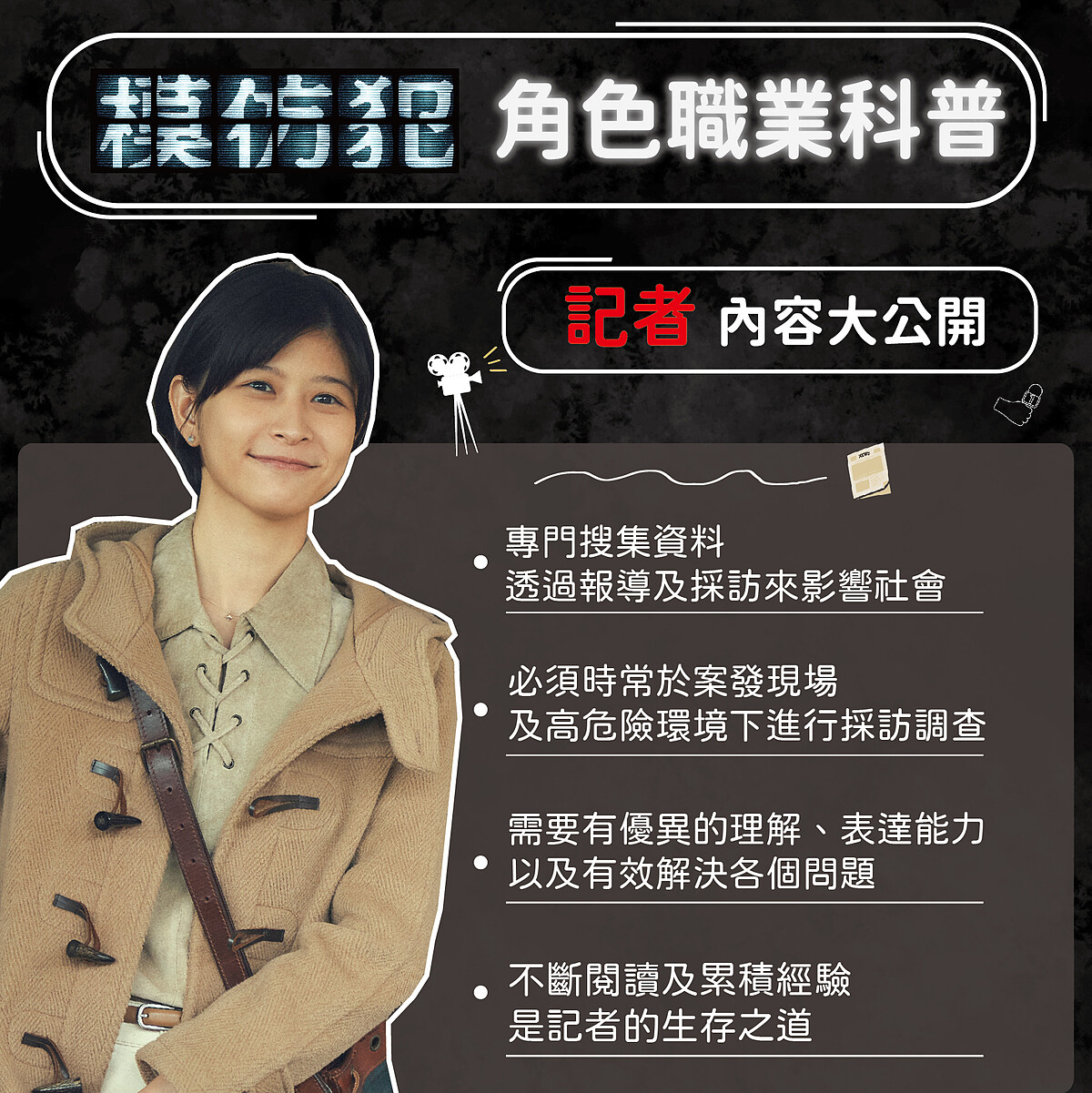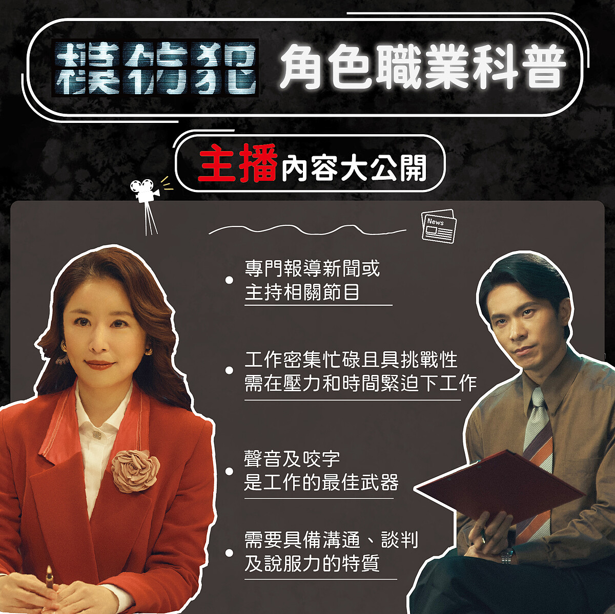 林心如飾演的主播姚雅慈,帶領民眾揭開社會各個角落,並長期在壓力及時間緊迫的情況下工作,是個極具挑戰的職業。