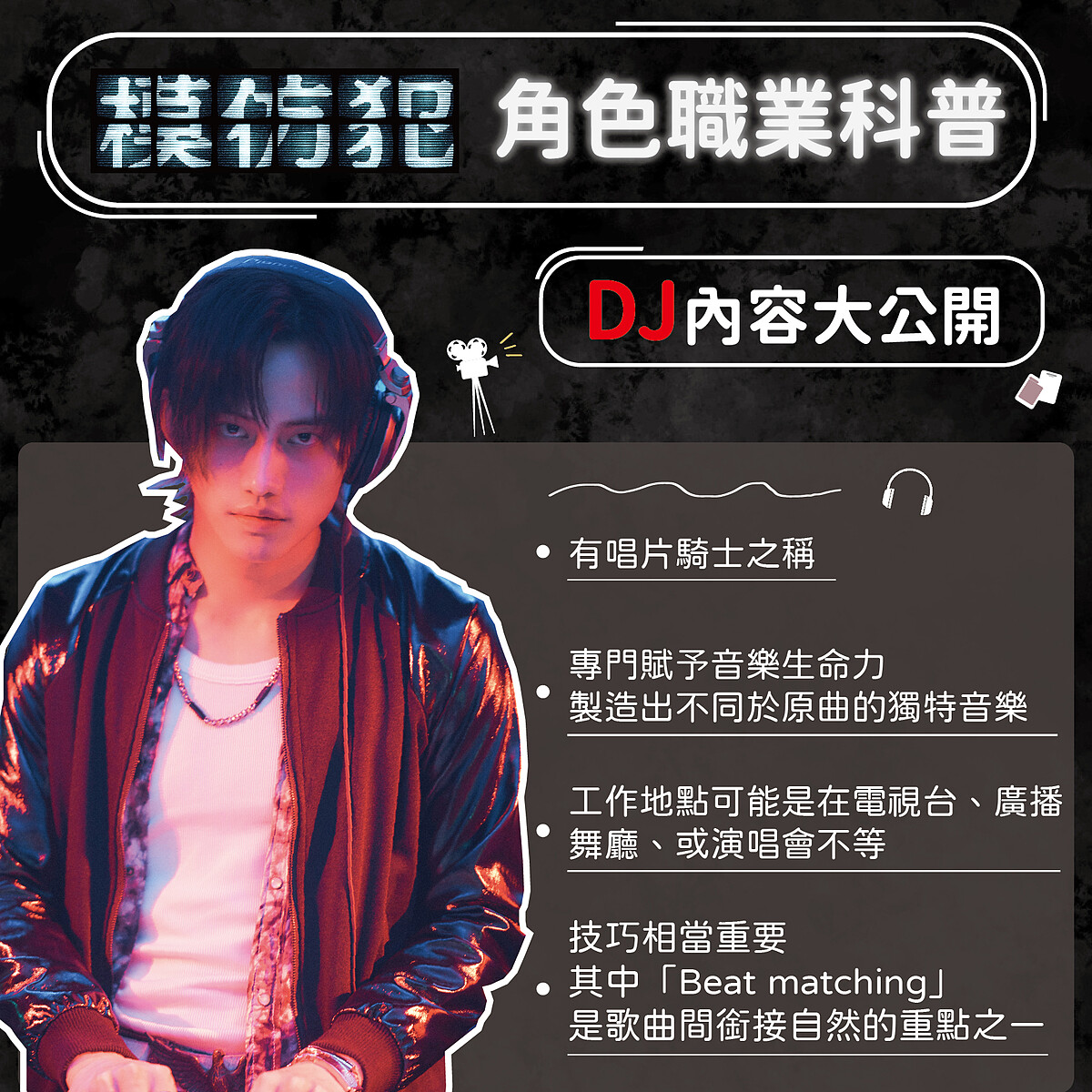 范少勳飾演的帥氣DJ沈嘉文,專門創造出不同於原曲的獨特音樂,並賦予新的生命力,是活動現場當中不可或缺的靈魂角色。