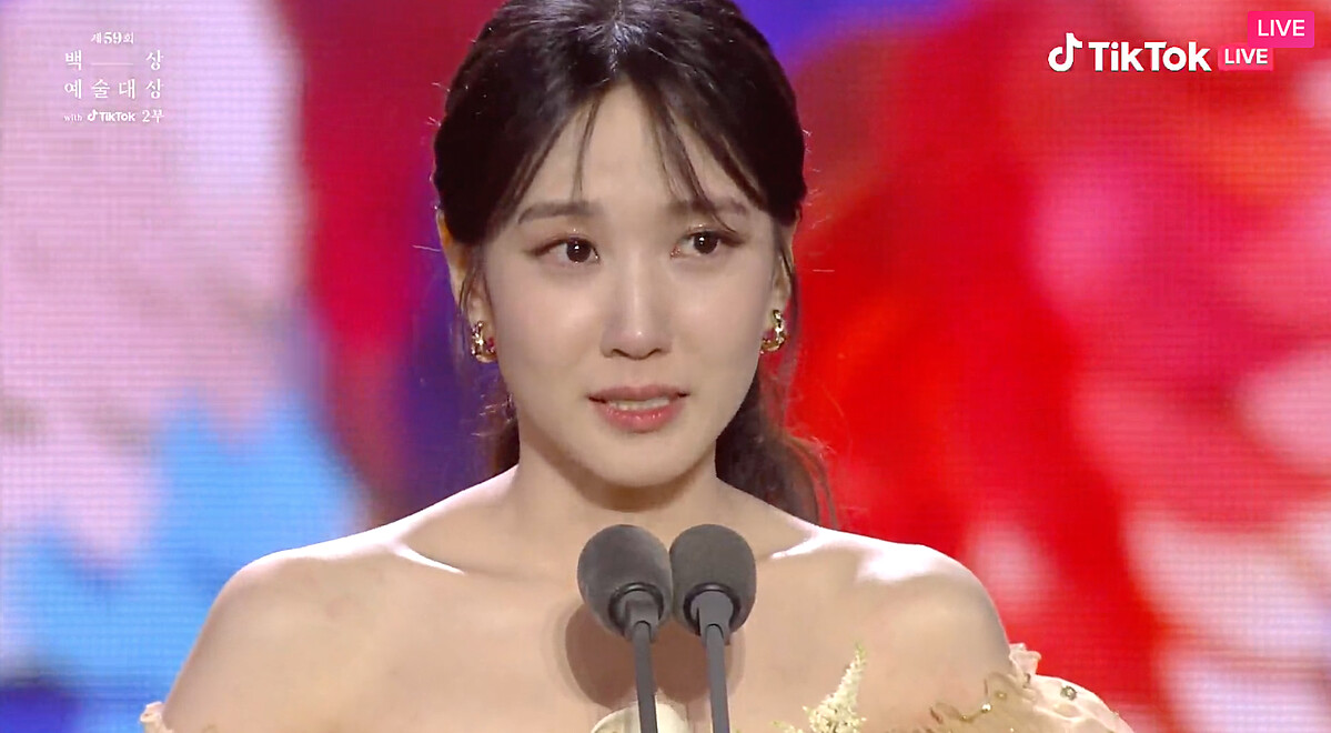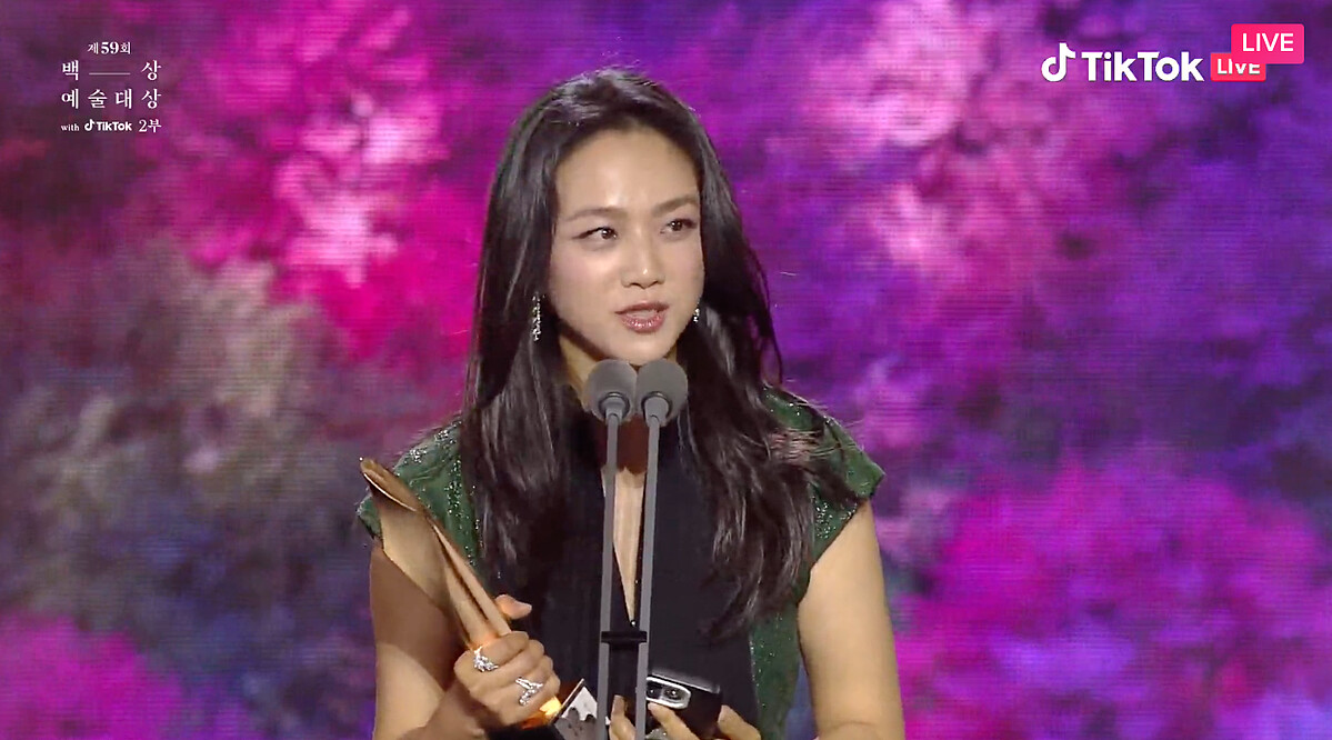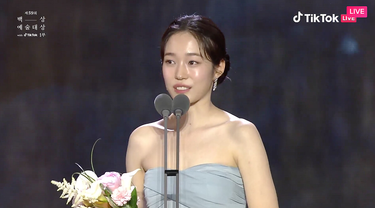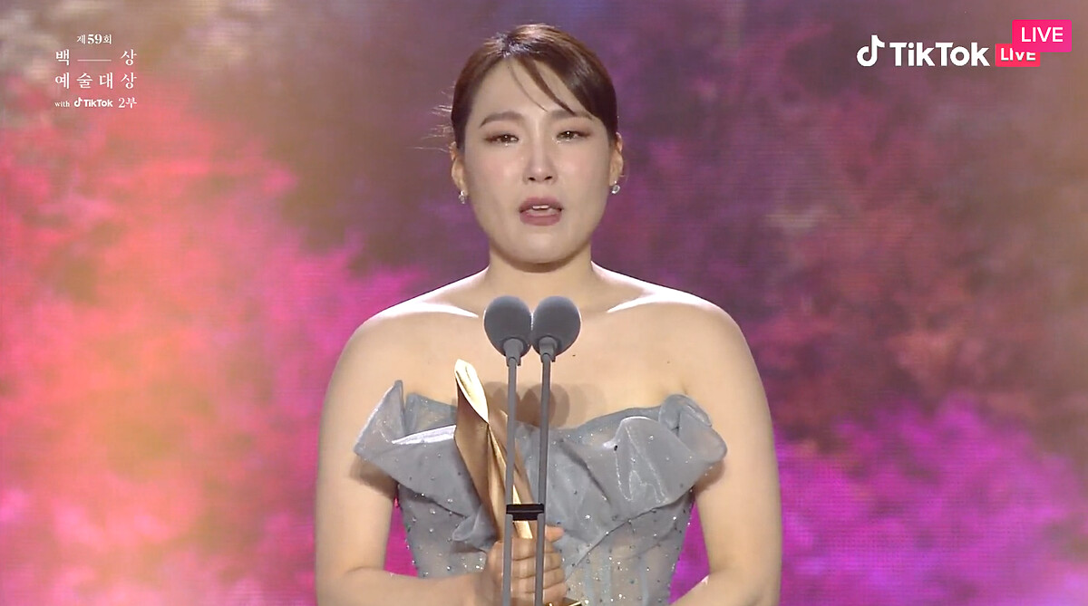 我得獎了,涎鎮啊。如果沒有那些人的話,應該就不會有文同垠了,真的很感謝。真心感謝填滿文同垠不足的安吉鎬導演。總是在我身邊的妝髮造型組,我愛你們。我得到這個獎金銀淑編劇應該也感到很榮幸吧,感謝她把文同垠交給我。希望媽媽可以久違地開心一下。