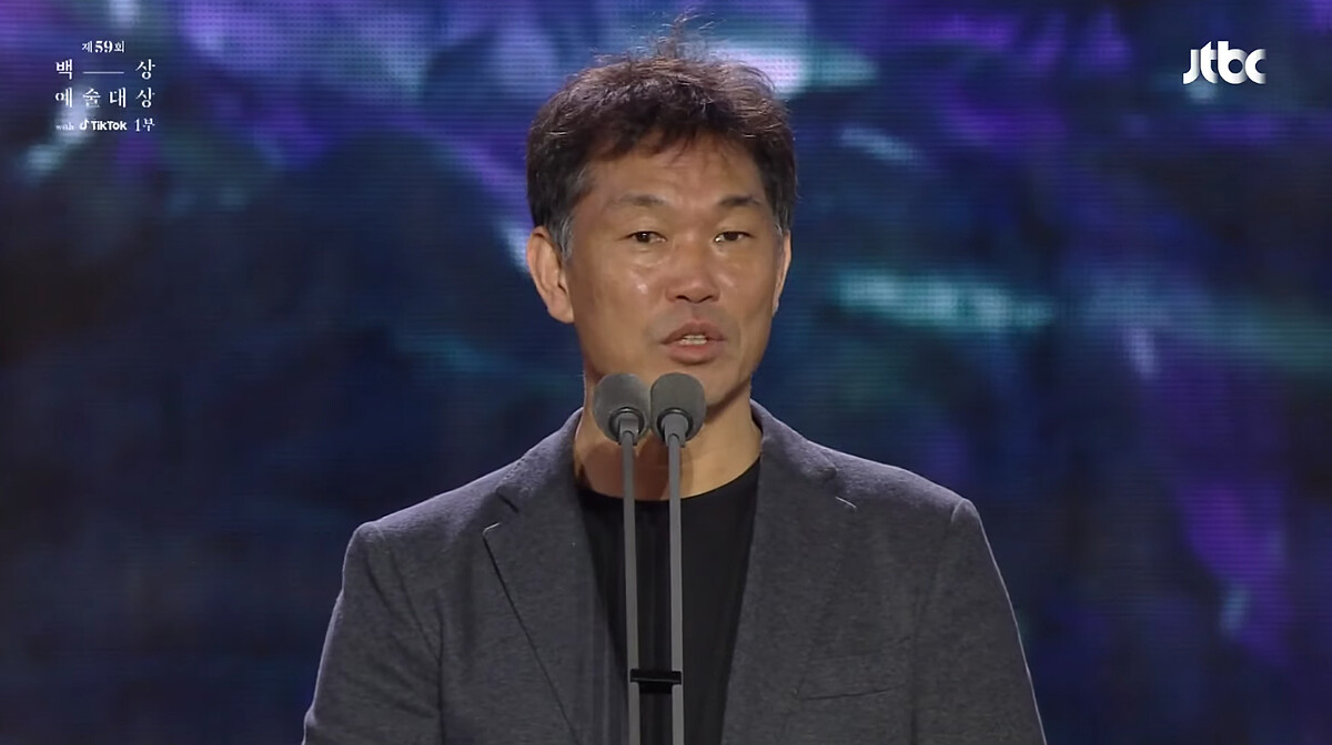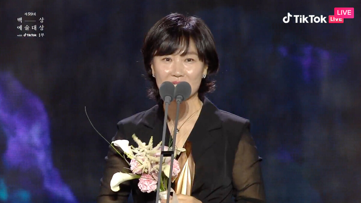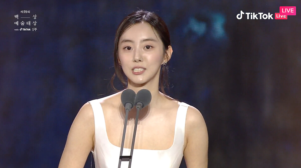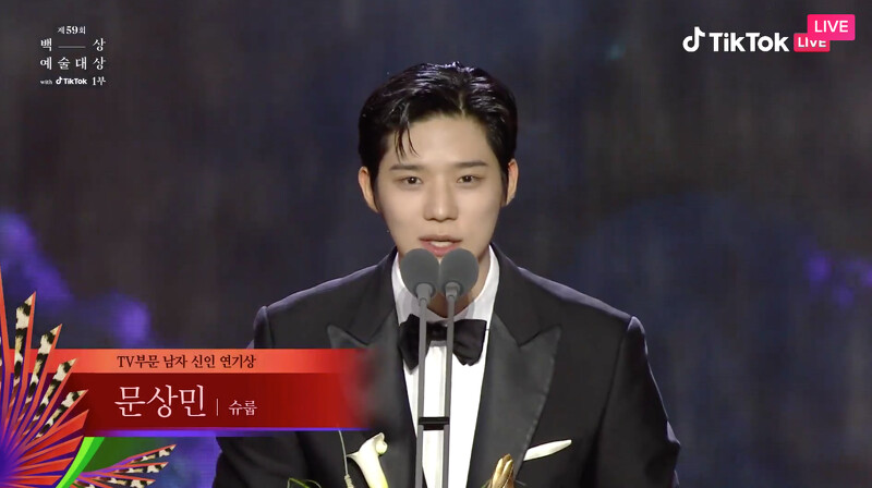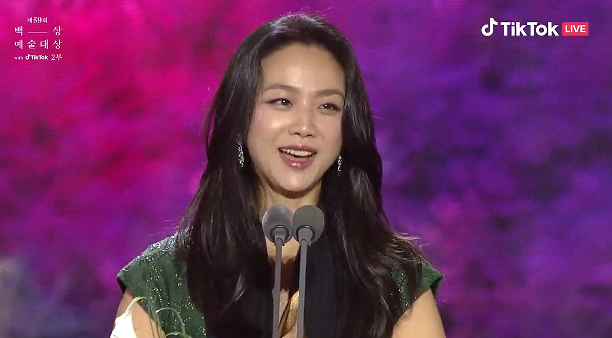 我得獎了,涎鎮啊。如果沒有那些人的話,應該就不會有文同垠了,真的很感謝。真心感謝填滿文同垠不足的安吉鎬導演。總是在我身邊的妝髮造型組,我愛你們。我得到這個獎金銀淑編劇應該也感到很榮幸吧,感謝她把文同垠交給我。希望媽媽可以久違地開心一下。