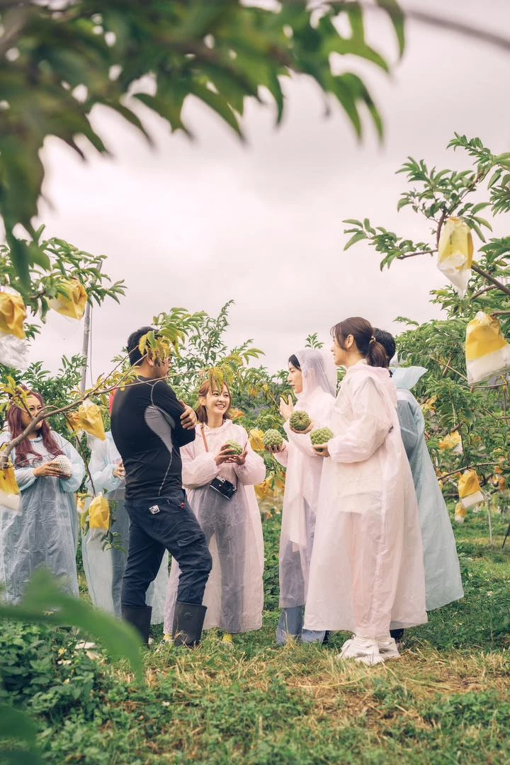 身為台東在地人的家家,也分享自己來到家鄉特別自在,她也帶著成員們一同農事體驗採釋迦,雖然美中不足是採釋迦過程中下雨了,但大家「第一次採釋迦」的回憶還是相當難忘。